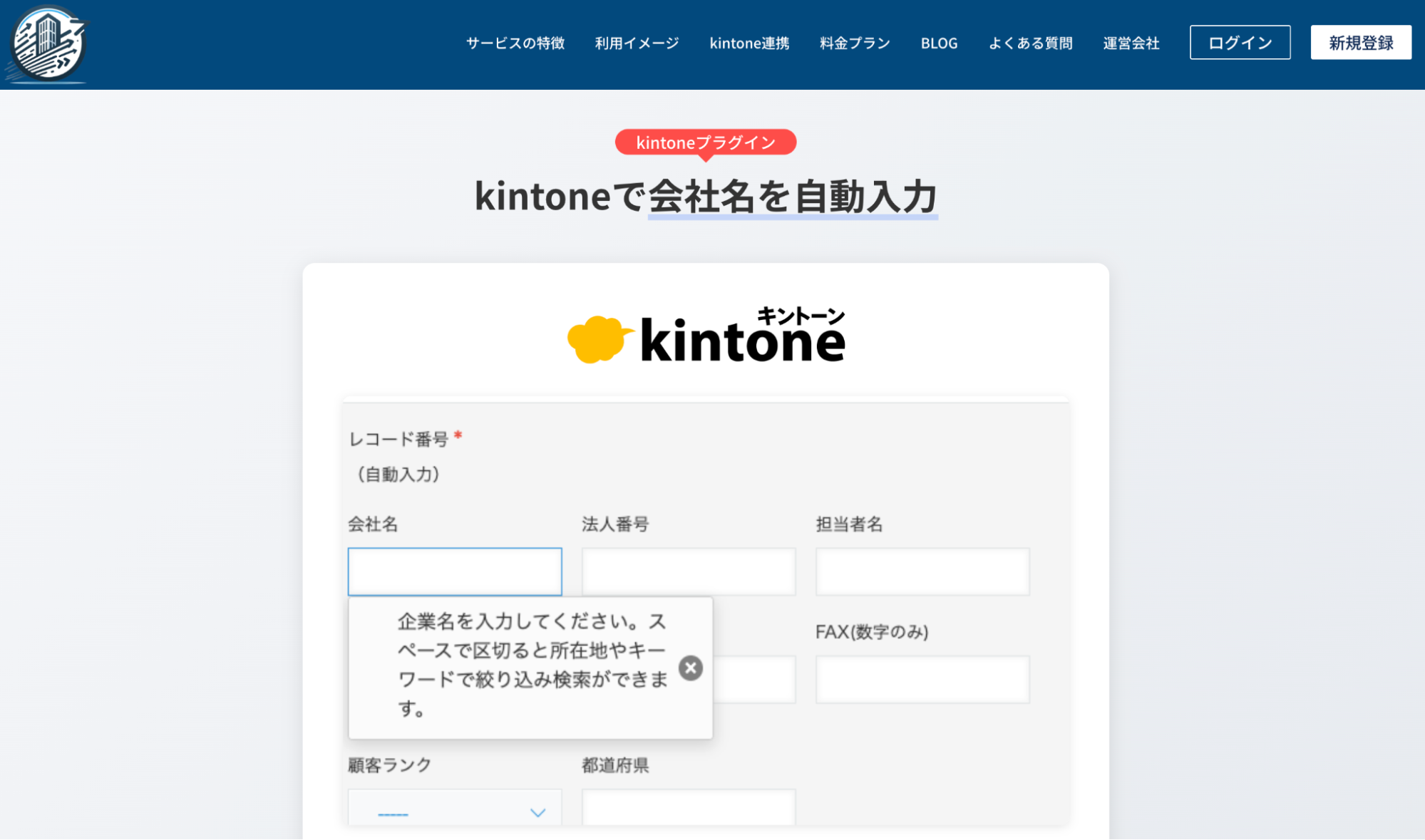 そのため、すでに運用しているWebサイトのデザインや仕組みを大きく変えずに、スムーズな導入が可能です。また、kintoneの専用プラグインも用意されており、顧客管理アプリ上でも企業情報を自動的に補完します。