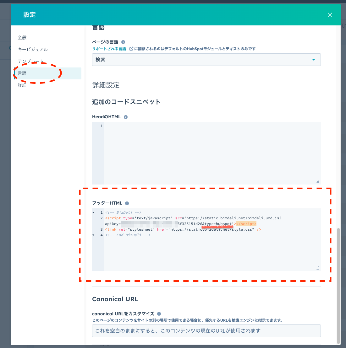 2.次に、最下部にある「追加のコードスニペット」の「フッターHTML」欄に、BizDeliの埋め込みタグを貼り付けます。