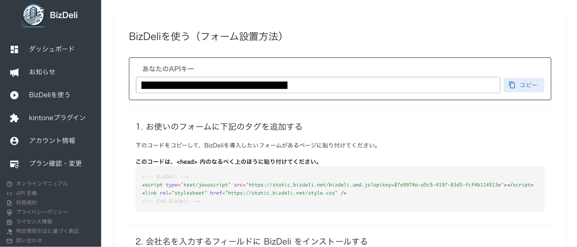 「BizDeliを使う」をクリックすると、フォーム設置方法が表示され、専用のAPIキーを含んだタグが発行されます。