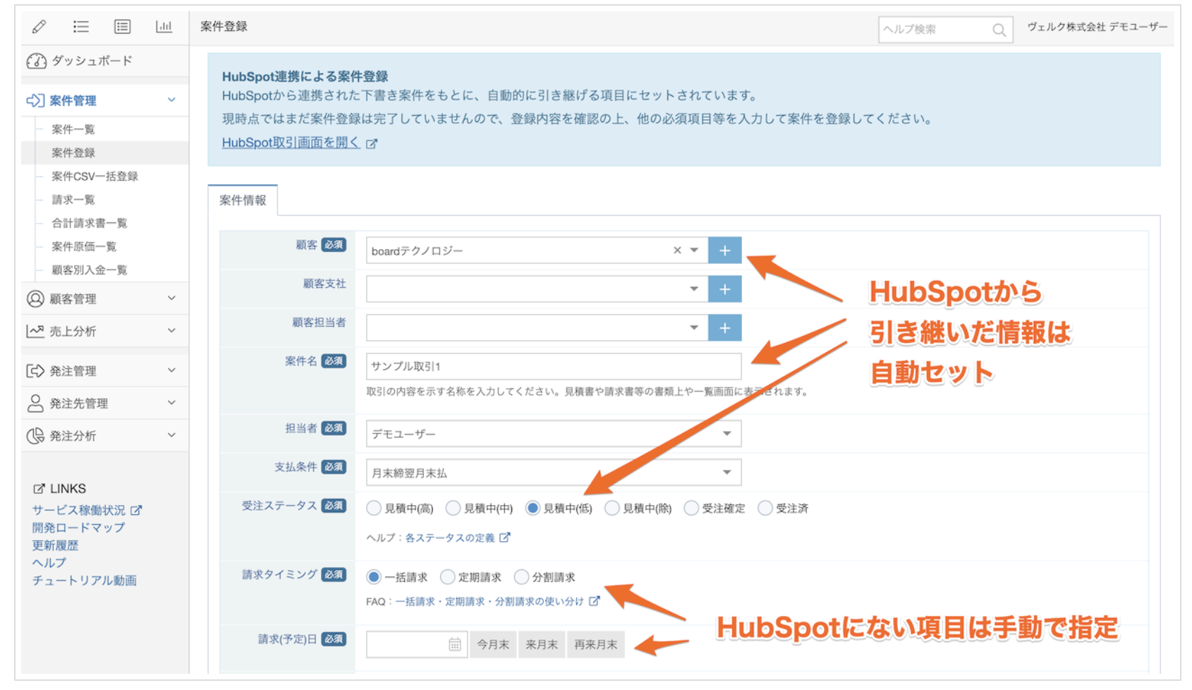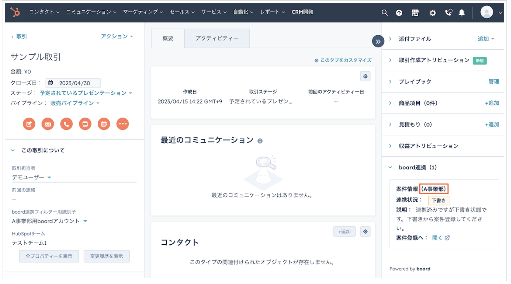 boardは、案件単位で物事を管理する仕組みが特徴です。下書き案件から正式な案件登録画面に進むと、HubSpotの情報が自動で反映されます。