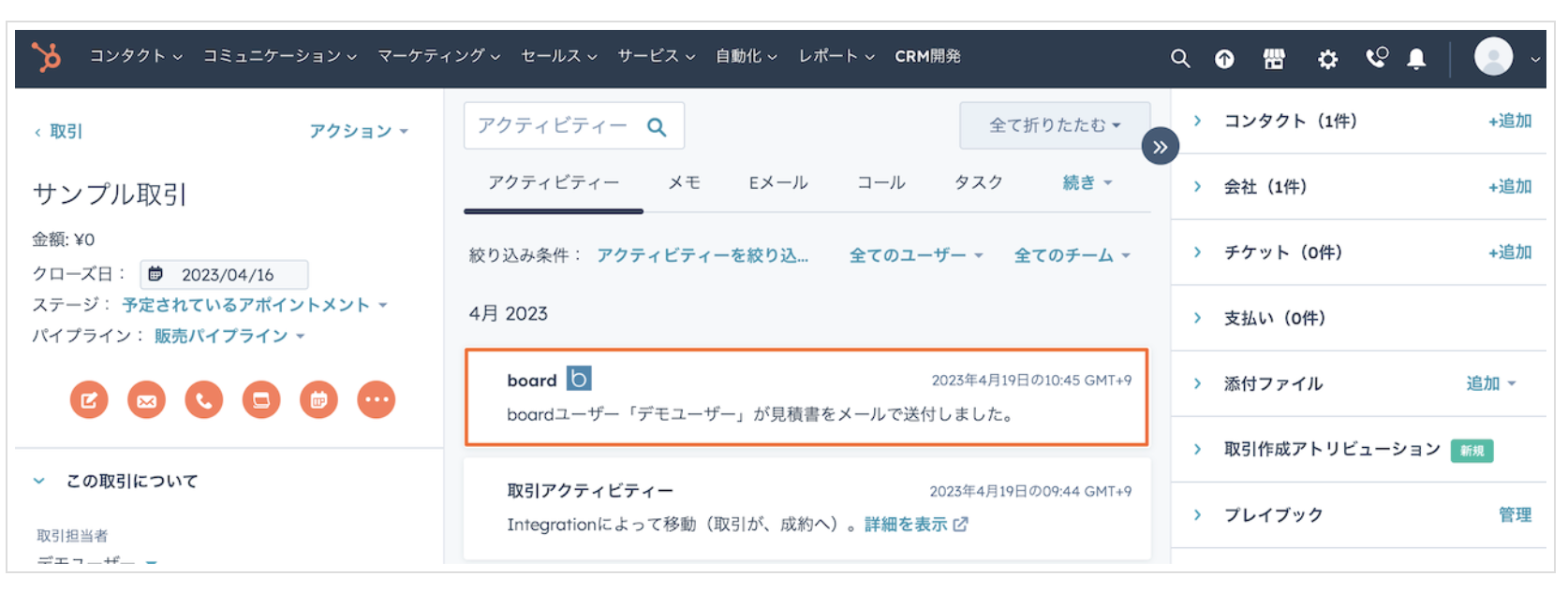 なお、HubSpotの取引画面の右下に、boardとの情報連携をチェックできるセクションが設けられています。このセクションから、boardの案件や見積書の画面への移動が可能です。
