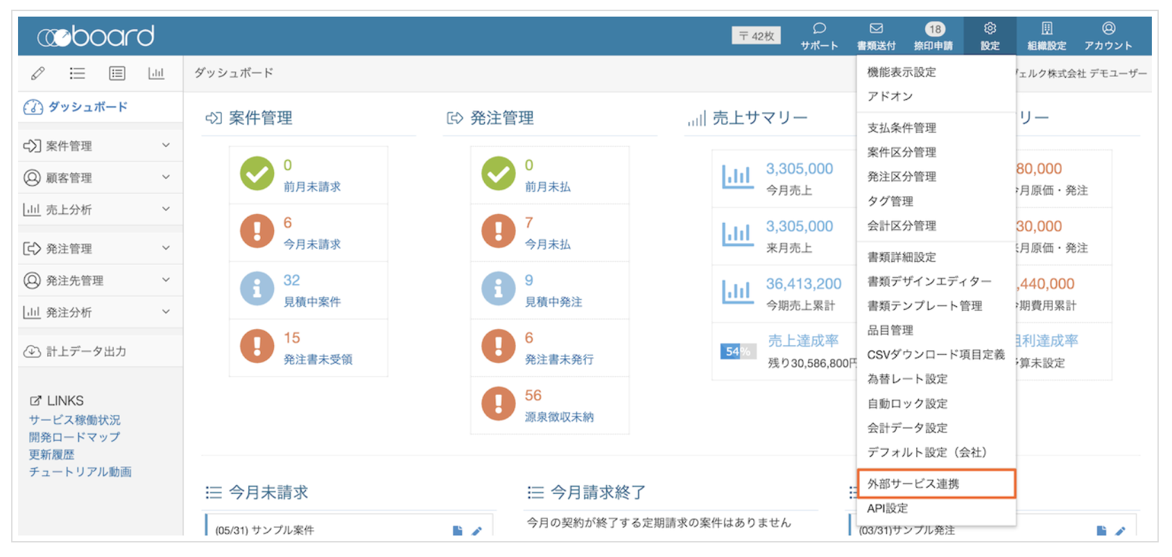 boardの「設定」メニューから「外部サービス連携」を選択します。