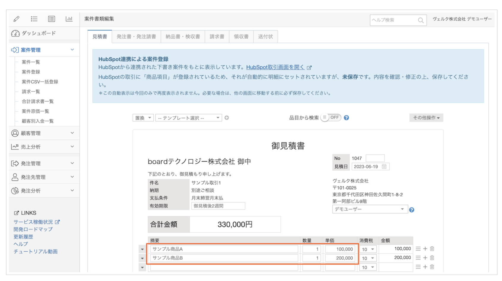 案件登録の完了後は、見積書の編集画面に進みます。HubSpotで登録済みの「商品項目」は、見積書編集画面に自動で取り込まれます。