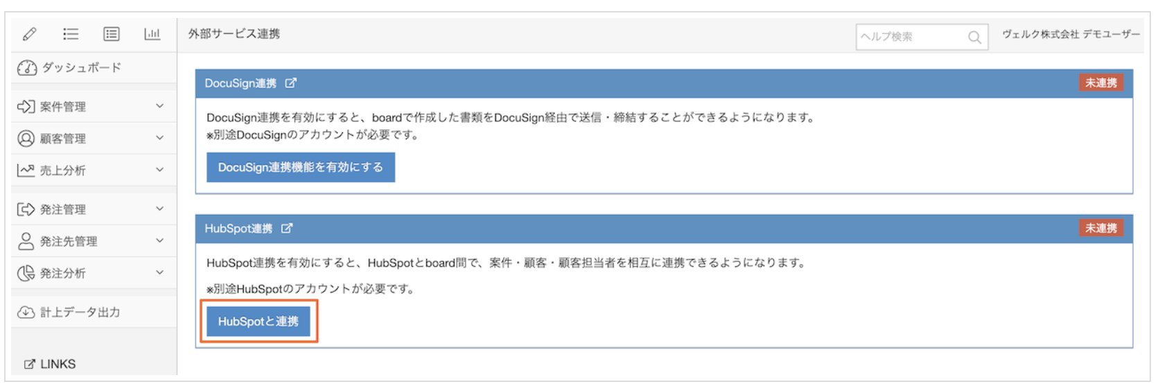 「外部サービス連携」画面で「HubSpotと連携」のボタンをクリックしましょう。