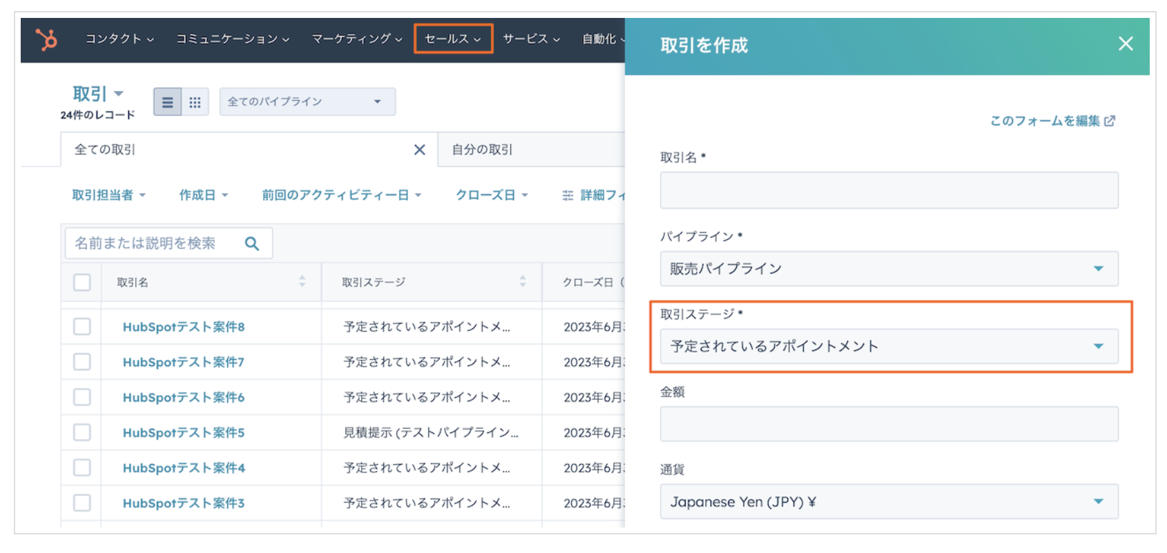 まずはHubSpotの「セールス」タブから「取引」を選び、取引の新規作成をしましょう。