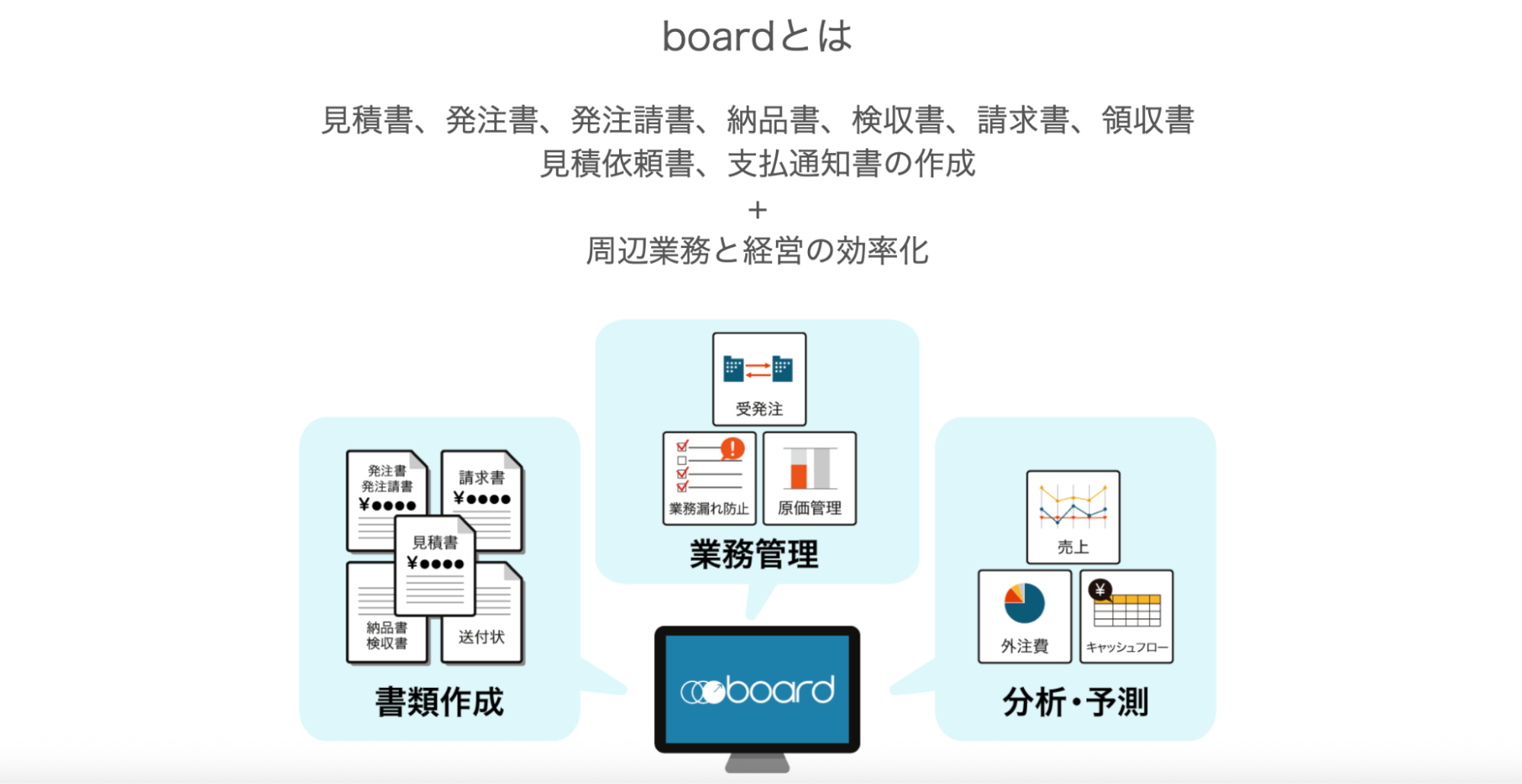 boardは見積書や発注書、納品書や請求書など各種書類の作成を中心に、周辺業務の効率化を幅広くカバーできます。