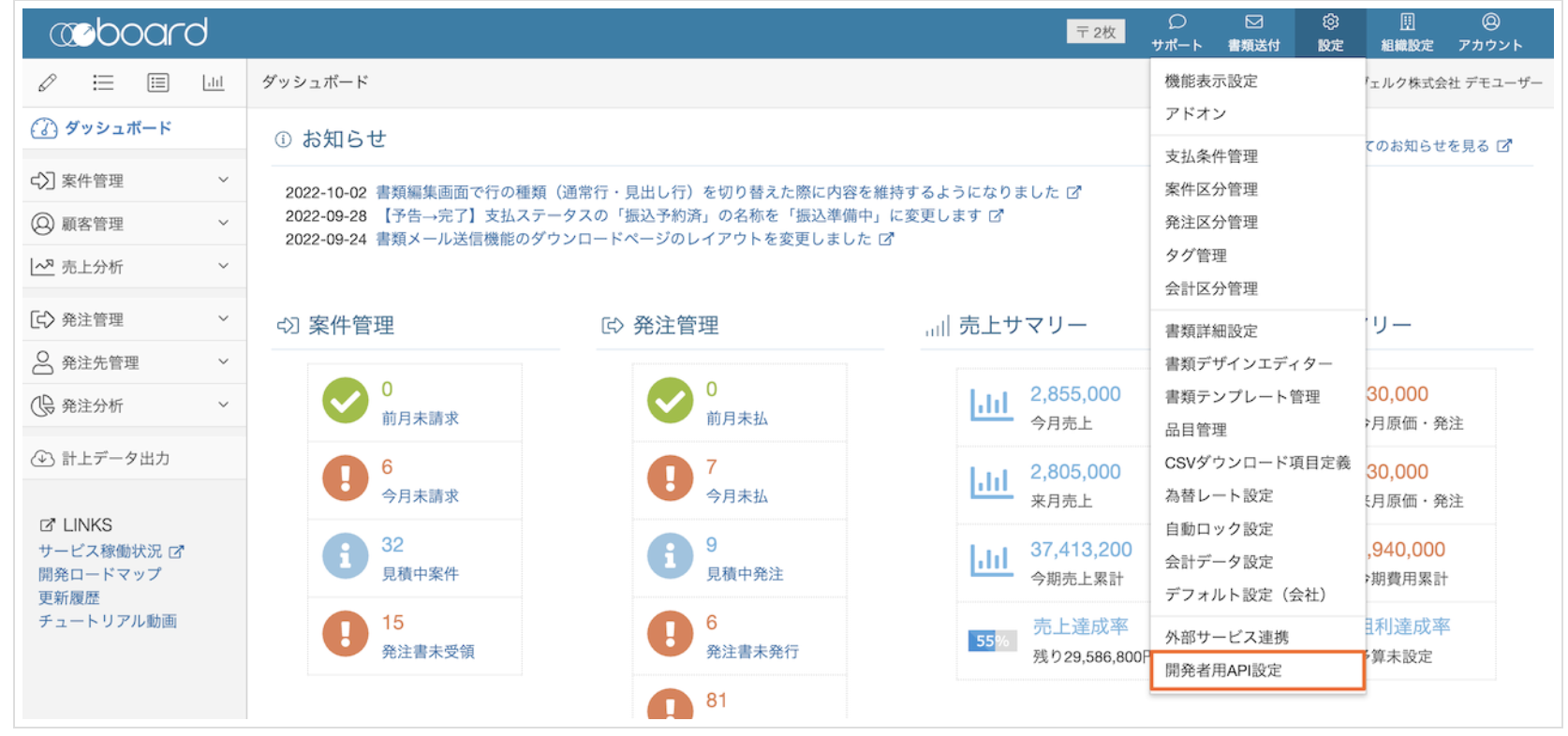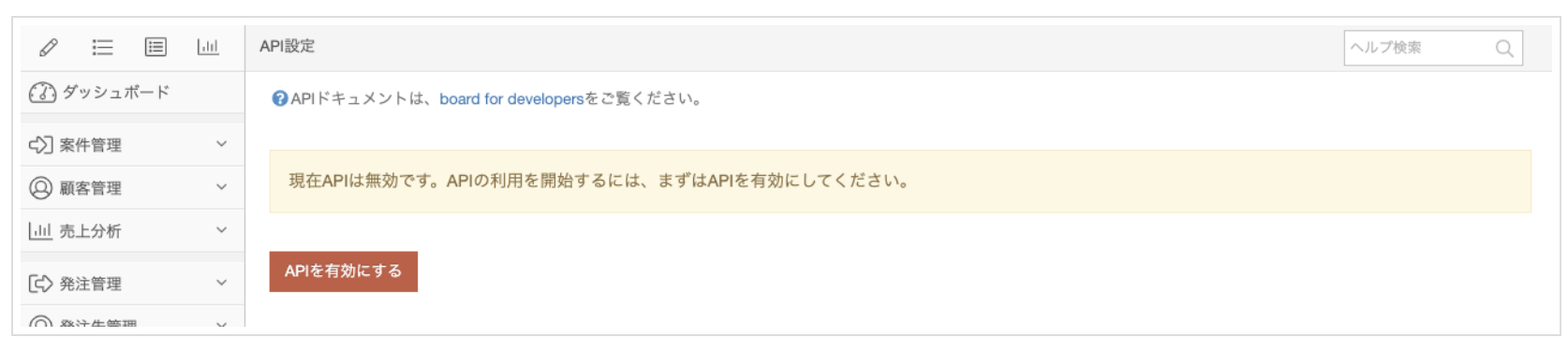 まずは、boardの「設定」メニューから「開発者用API設定」をクリックし、新規連携のためのAPI設定をします。