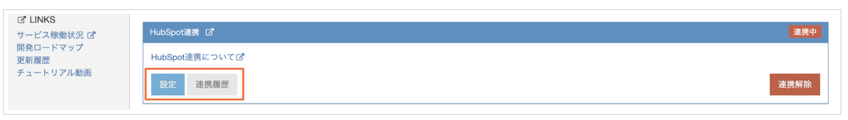 アプリの接続を許可すると、外部サービス連携画面の「HubSpot連携」セクションに、下図のような表示が現れます。