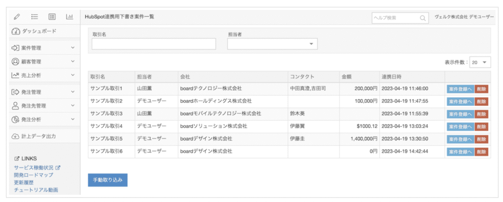 HubSpotから取り込まれた情報は、直接案件として登録されるのではなく、まずは「下書き案件」として一時保存されます。HubSpotとboardはそれぞれ役割や目的の違いから所有している情報が異なるためです。