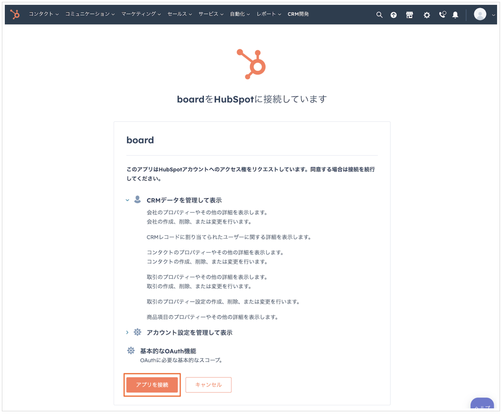 HubSpot画面に移動すると、下図のような連携可否を求める画面が出るので「アプリの接続」をクリックします。