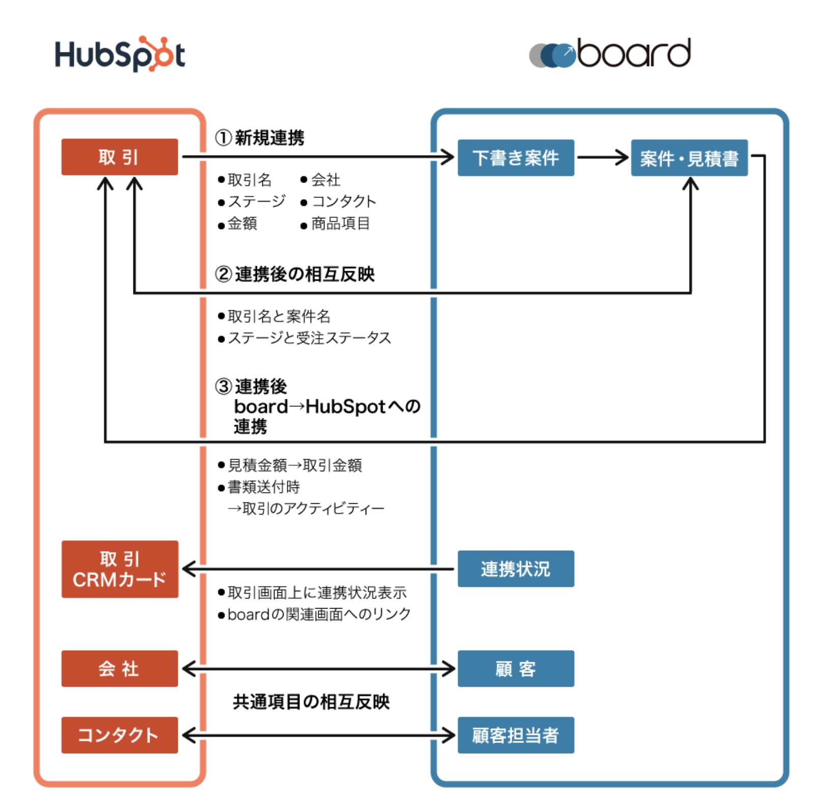 HubSpotとboardを連携した後、それぞれの相互反映の方法を以下の項目別に見ていきましょう。