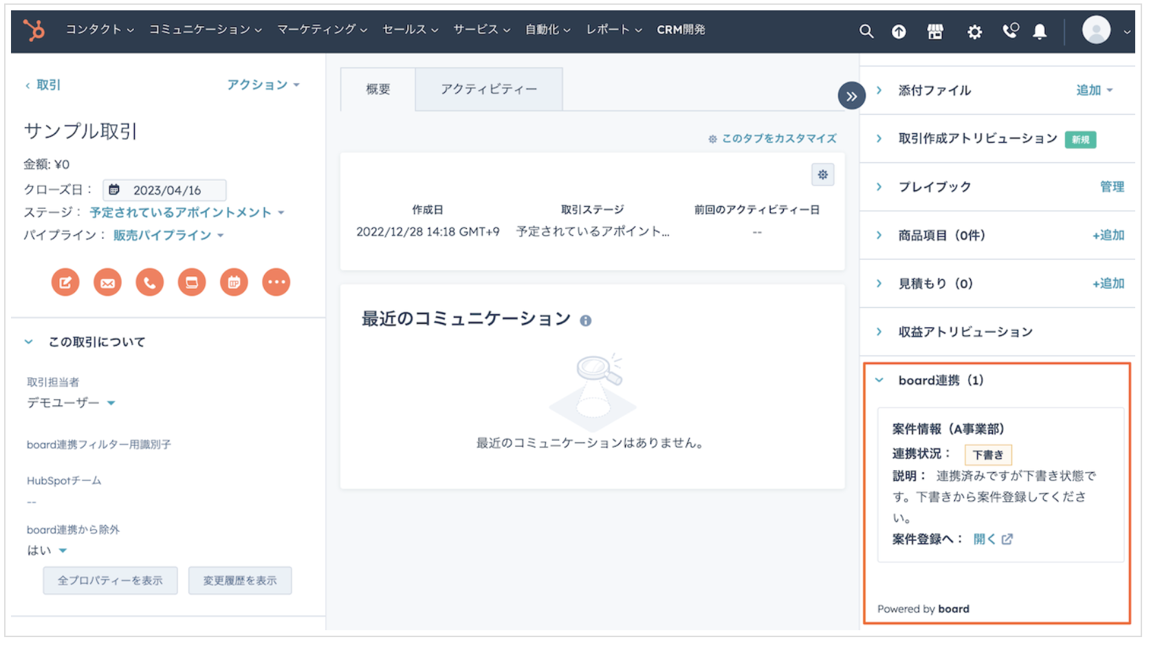 以下の動画内では、boardとHubSpotの連携方法や操作方法などをデモ画面で解説しているので、あわせてチェックしてみてください。