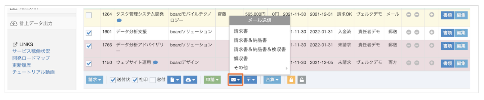 作成した見積書や請求書等などの各種書類は、board上で直接メール送信が可能です。まず、メールのアイコン「メール送信」をクリックし「請求書」を選択します。