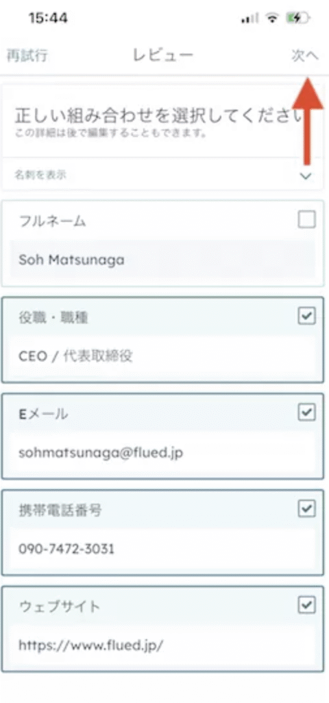 スキャン後、OCRによって自動抽出された氏名・役職・メール・電話番号などの情報が表示されます。内容を確認し、必要に応じて修正した上で保存しましょう。
