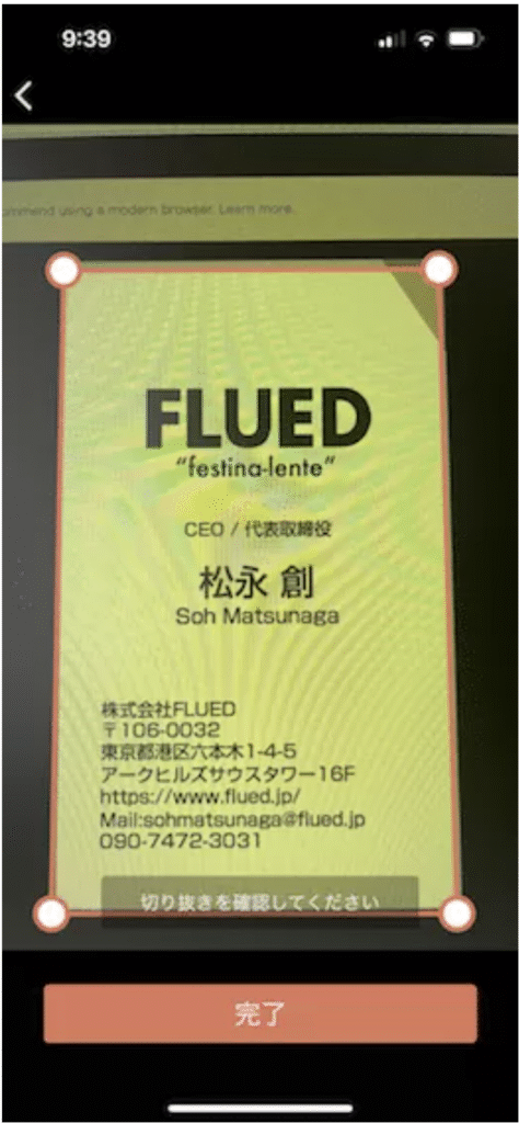 名刺全体がフレームに収まるように撮影し、必要に応じて四隅を調整して完了します。