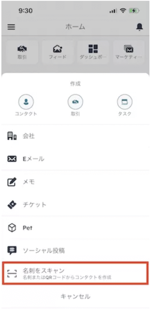 画面下部中央の「+」アイコンをタップすると、名刺スキャンを含む作成メニューが表示されます。