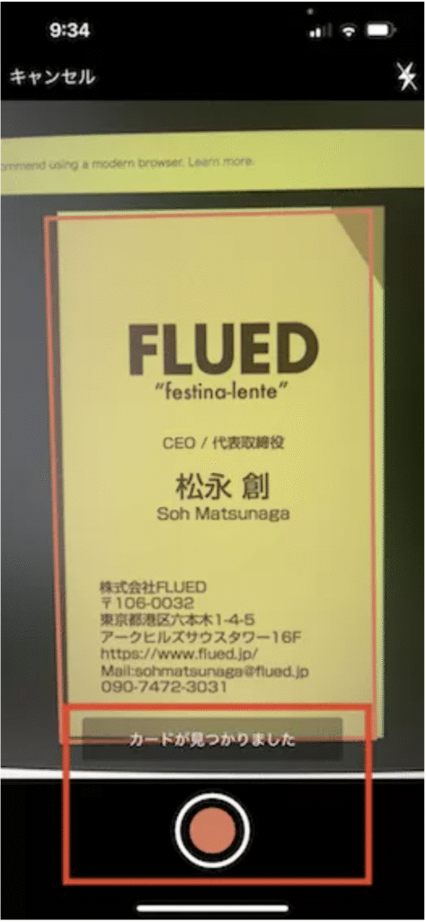 メニューから「名刺をスキャン」を選択し、スマホのカメラで名刺を撮影します。