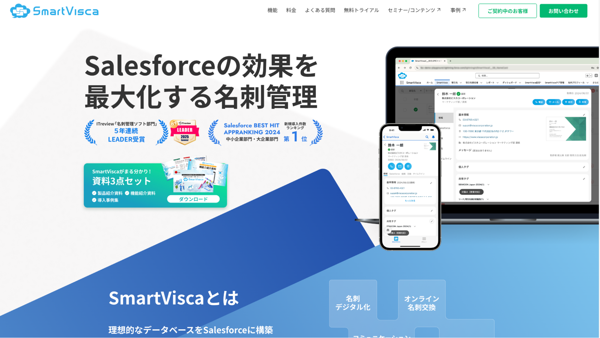 SmartViscaは、Salesforceと完全に統合できる名刺管理ツールです。名刺を取り込むと自動的にSalesforce上のデータが更新されるため、手作業での入力や同期にかかる工数を大幅に削減できます。