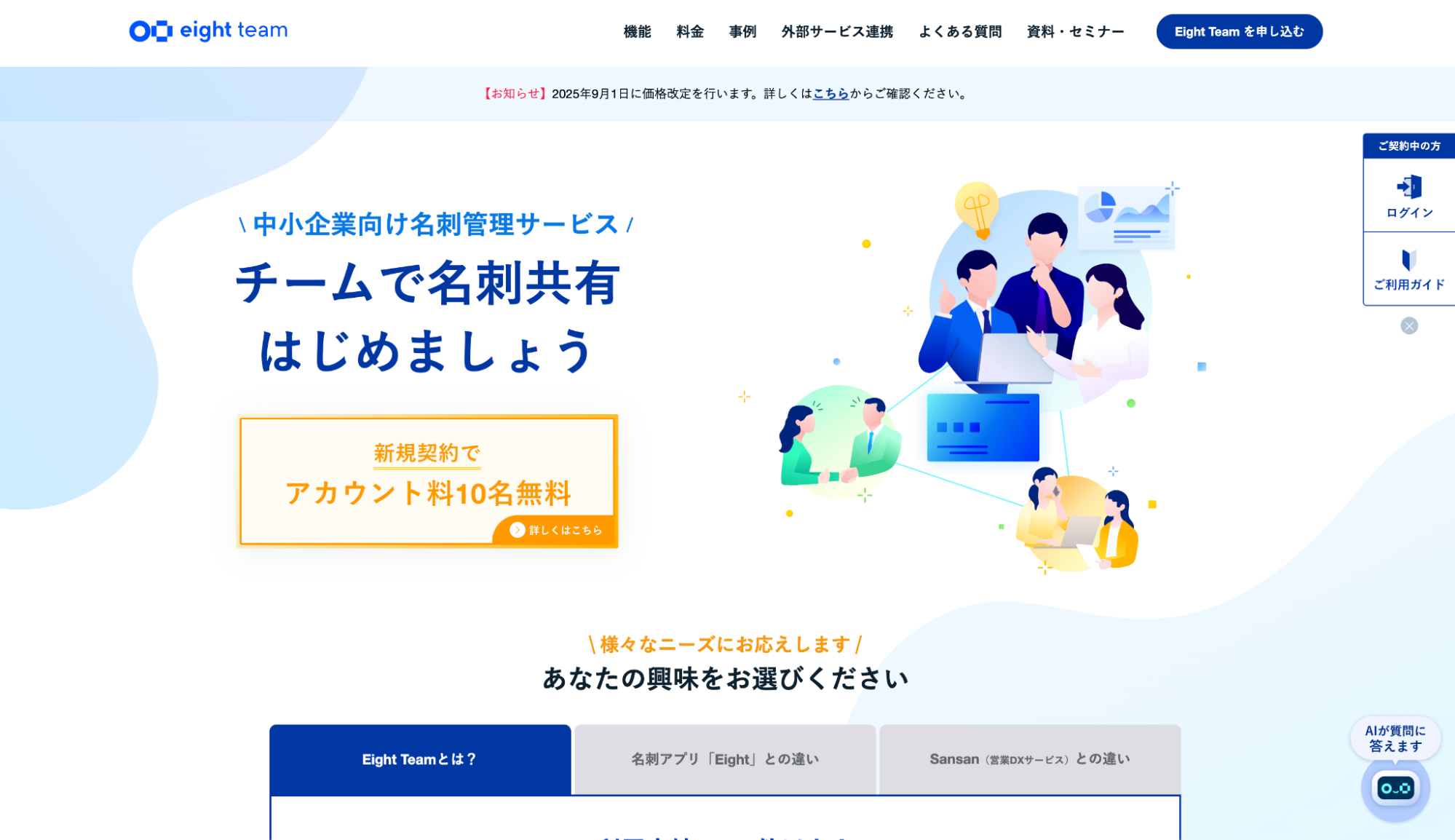 Eight Teamは、HubSpotと連携できる名刺管理ツールの中でもコストパフォーマンスに優れた選択肢です。特に中小企業や小規模チームでの導入実績が多く、初めてCRMと名刺管理を組み合わせたい企業に向いています。