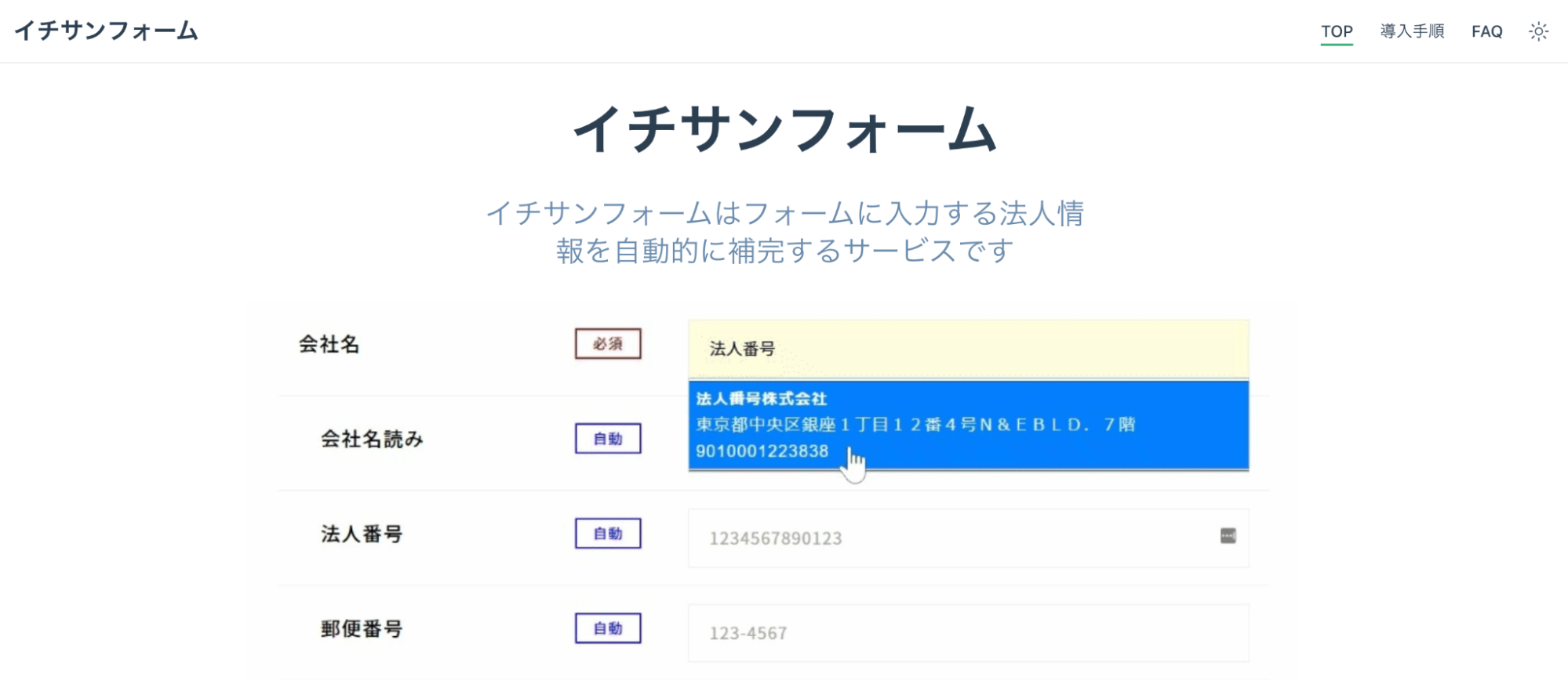 イチサンフォームを導入すれば、ユーザーが社名の一部を入力するだけで候補がリストアップされます。企業情報が自動補完されるため、正式名称を調べたり、住所を手入力したりする手間がかかりません。