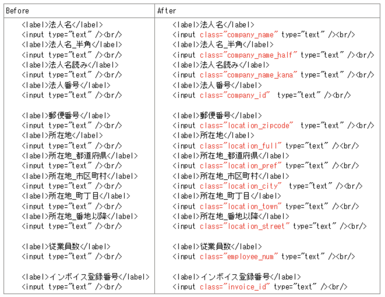 入力項目の準備ができたら、自動入力させたい箇所に指定されたclass名を付与します。例えば、法人名は「company_name」、法人番号は「company_id」などを指定しましょう。