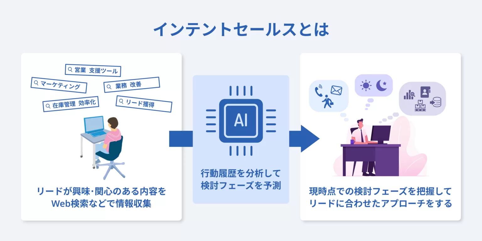 このような課題を解決に導くのが、インテントセールスです。インテントセールスとは、Web検索をはじめとするオンライン行動から顧客の興味や関心を把握し、購買意欲の高い見込み客に絞ってアプローチする新しい営業手法のことです。