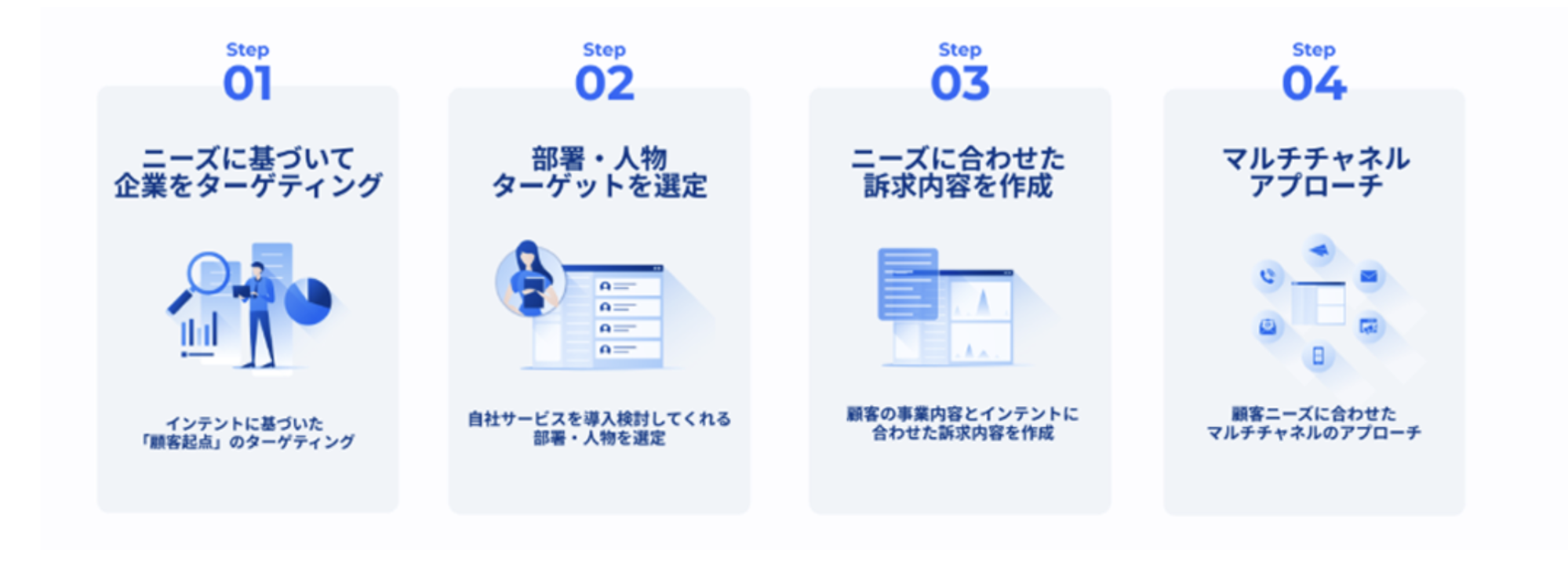 1.ニーズに基づいたターゲティング | ・インテントに基づき、顧客起点でターゲット企業を選定 ・必要に応じてパートナー企業とのデータ提供契約 |