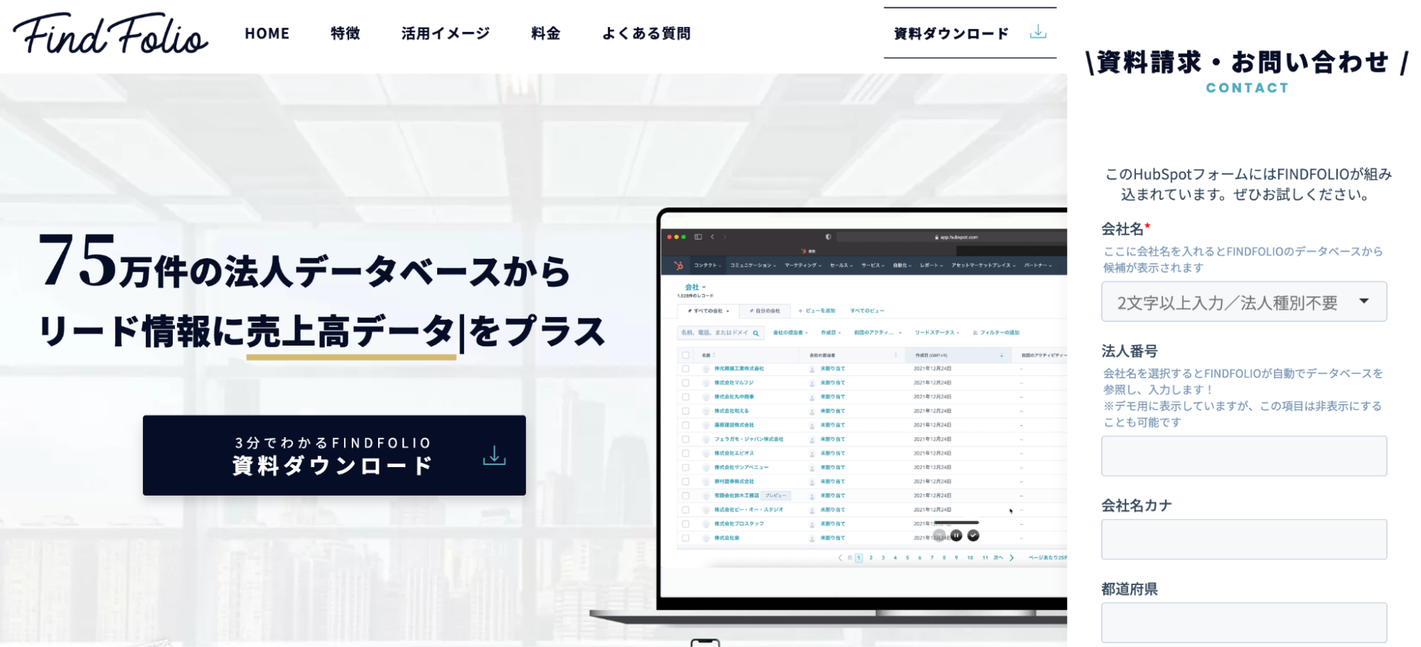 FINDFOLIOは、弊社FLUEDが提供する導入・運用伴走支援ツールです。75万件の法人データと400万件の企業ニュース情報を活用し、リードに属性情報をプラスし企業ごとの関心を把握できます。