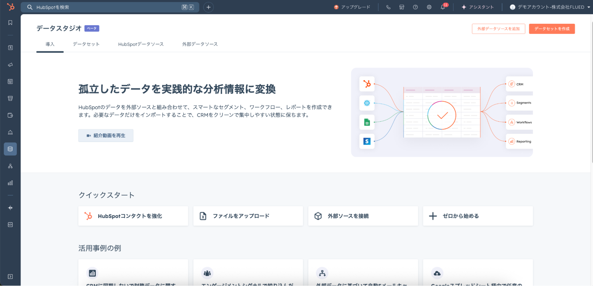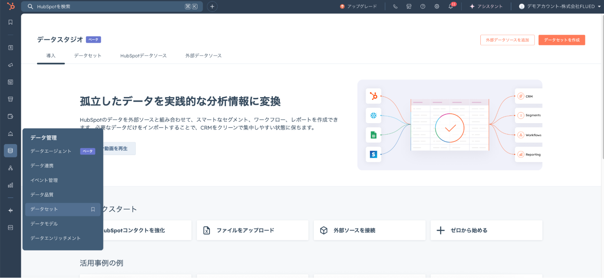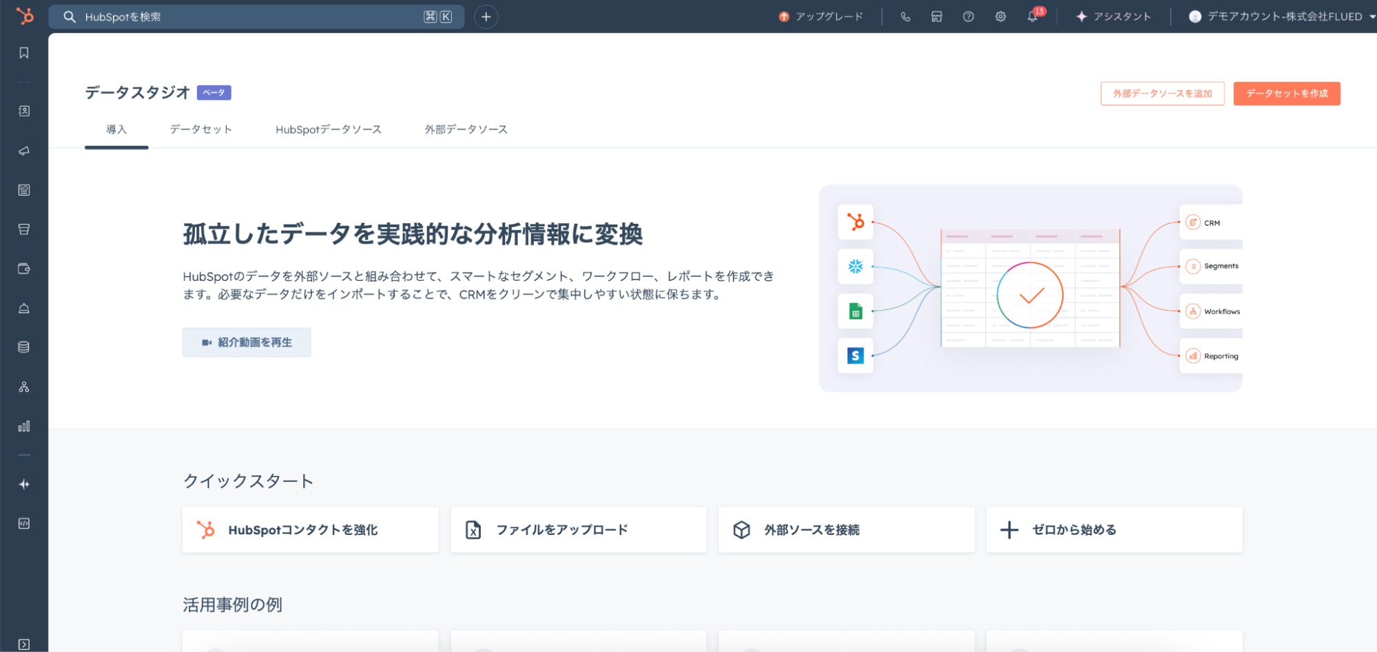 Data Studioを使うと、GoogleスプレッドシートやExcel、Snowflakeなどの外部データを直接接続できます。取り込んだデータは、HubSpotのCRMやリスト、ワークフロー、レポートなどで活用可能です。