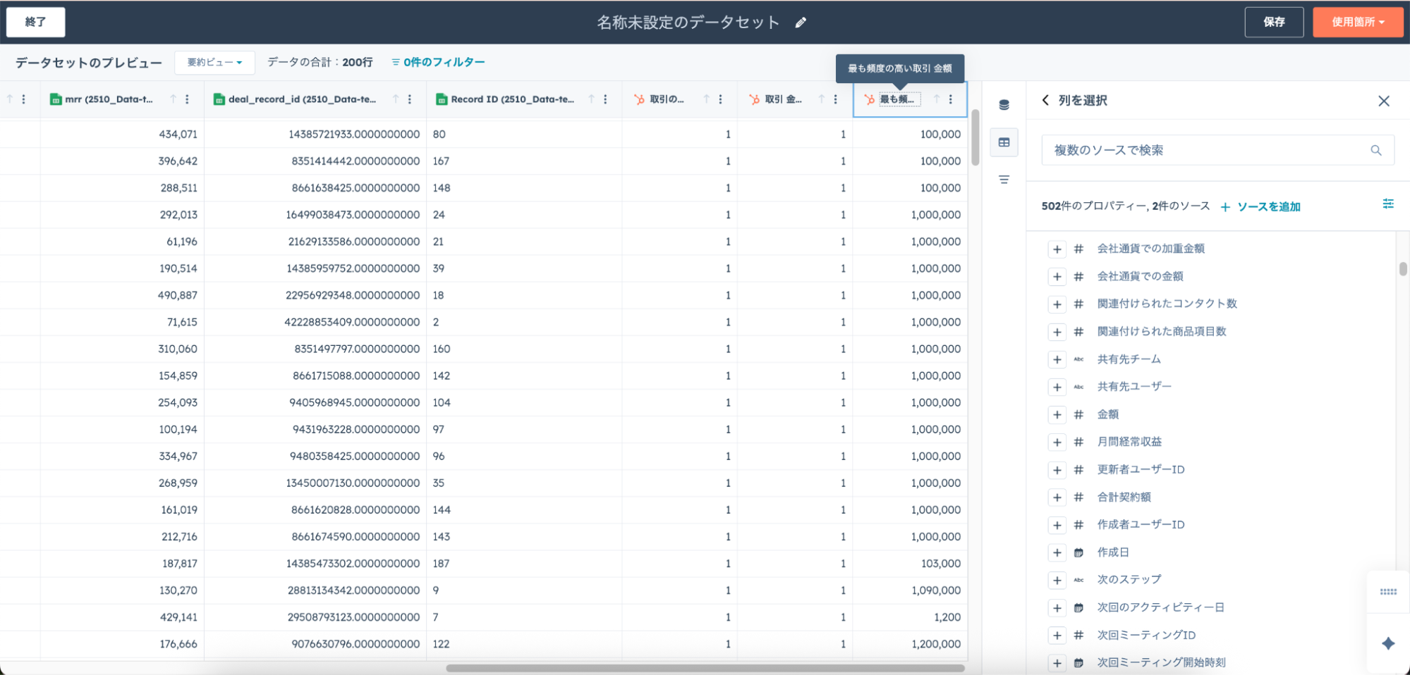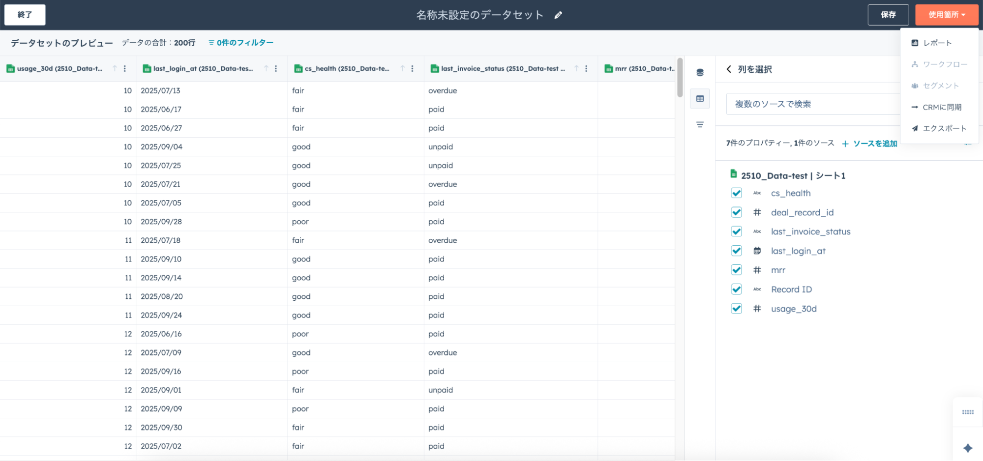 続いて、HubSpot側のデータを組み合わせましょう。使用したいデータを選択し「データセットの構築に使用」をクリックします。