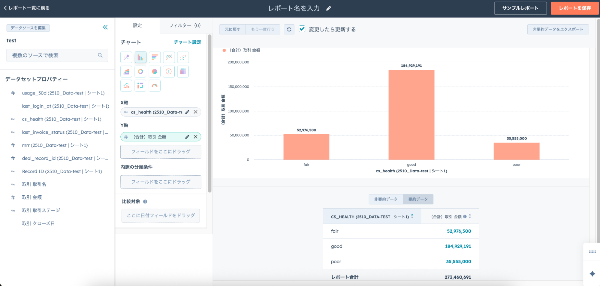 たとえば「レポート」を選択すると、整形したデータをもとにグラフや指標を可視化したレポートを手軽に作成できます。
