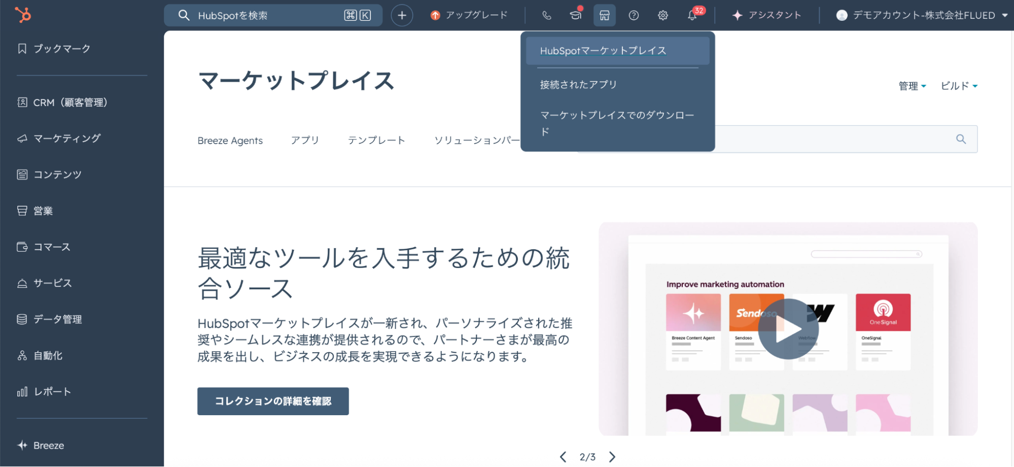 HubSpotの画面上部ナビゲーションから「マーケットプレイス」を開きます。