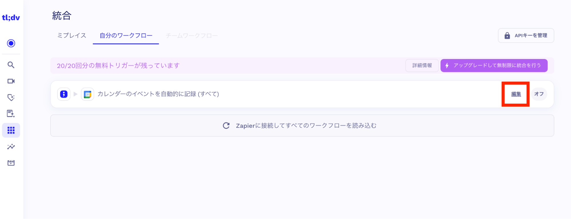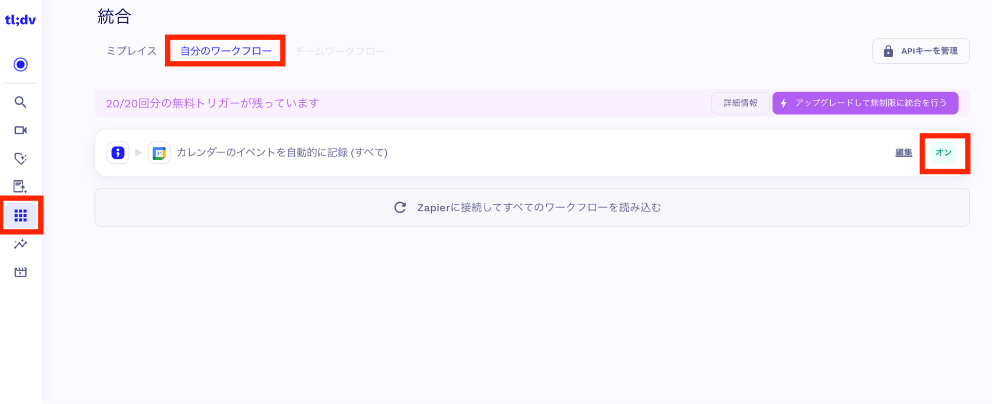 設定状況は、左側の「統合」アイコンから「自分のワークフロー」を選択して確認できます。下記の画面は、自動参加設定がONになっている状態です。