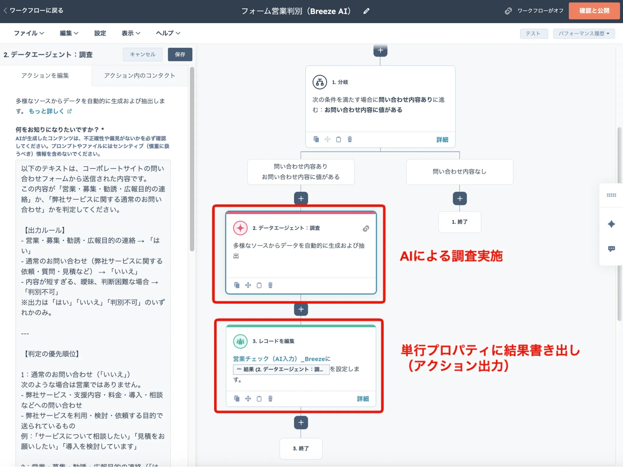 全体の流れは「問い合わせフォーム送信 → AIによる判定 → プロパティ更新」という形です。フォームから問い合わせが送信されると、その内容をBreezeデータエージェントが読み取り、営業目的かどうかを自動で判定します。