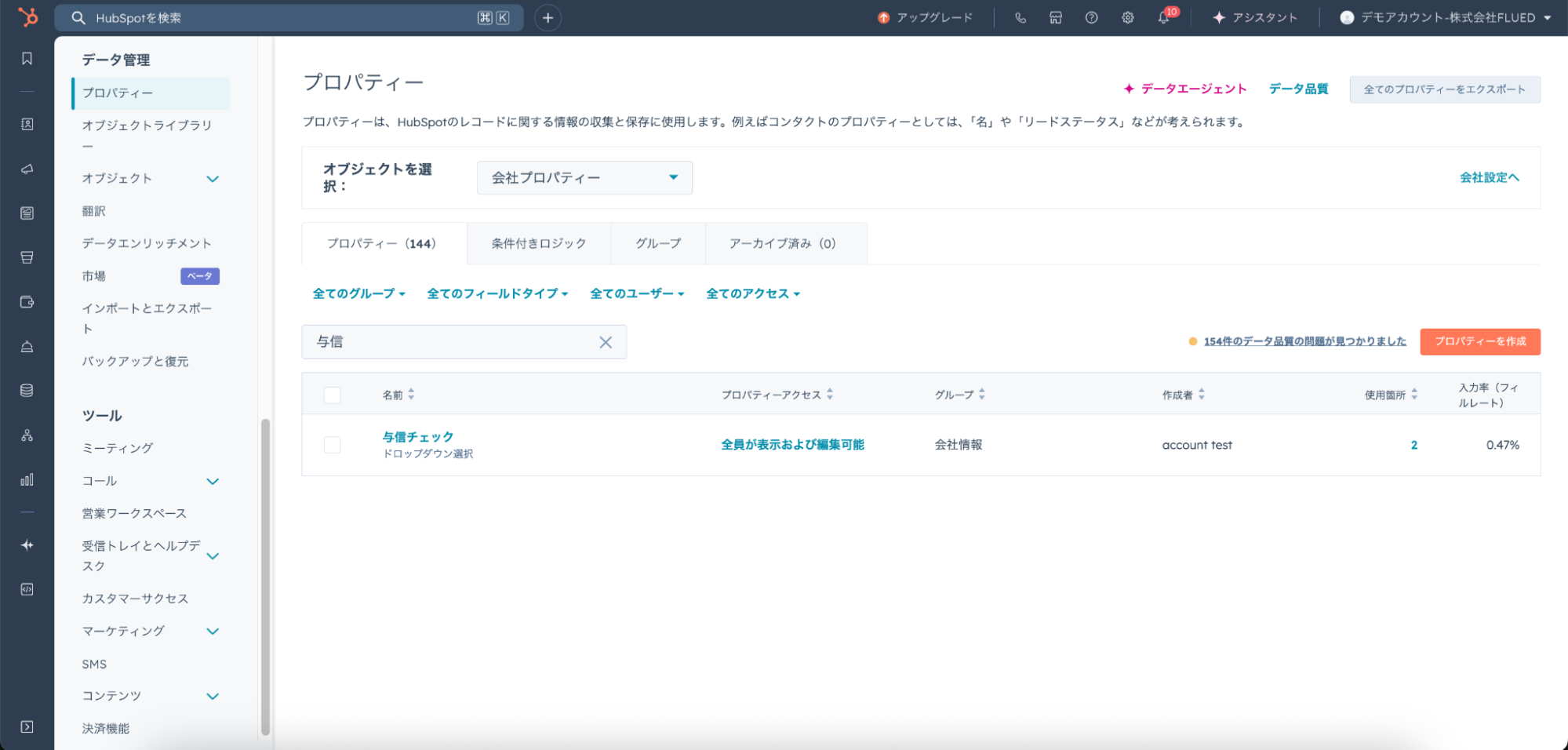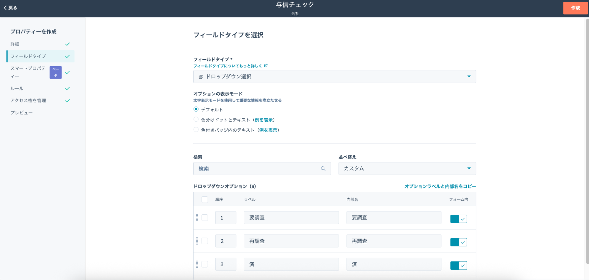 HubSpotに「与信チェック状況」「反社チェック状況」といったプロパティを作成します。