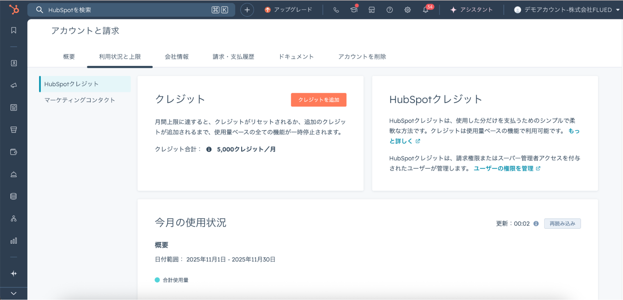 クレジット使用量の詳細は「HubSpotクレジット」をクリックした先にある「アカウントと請求」画面で確認可能です。