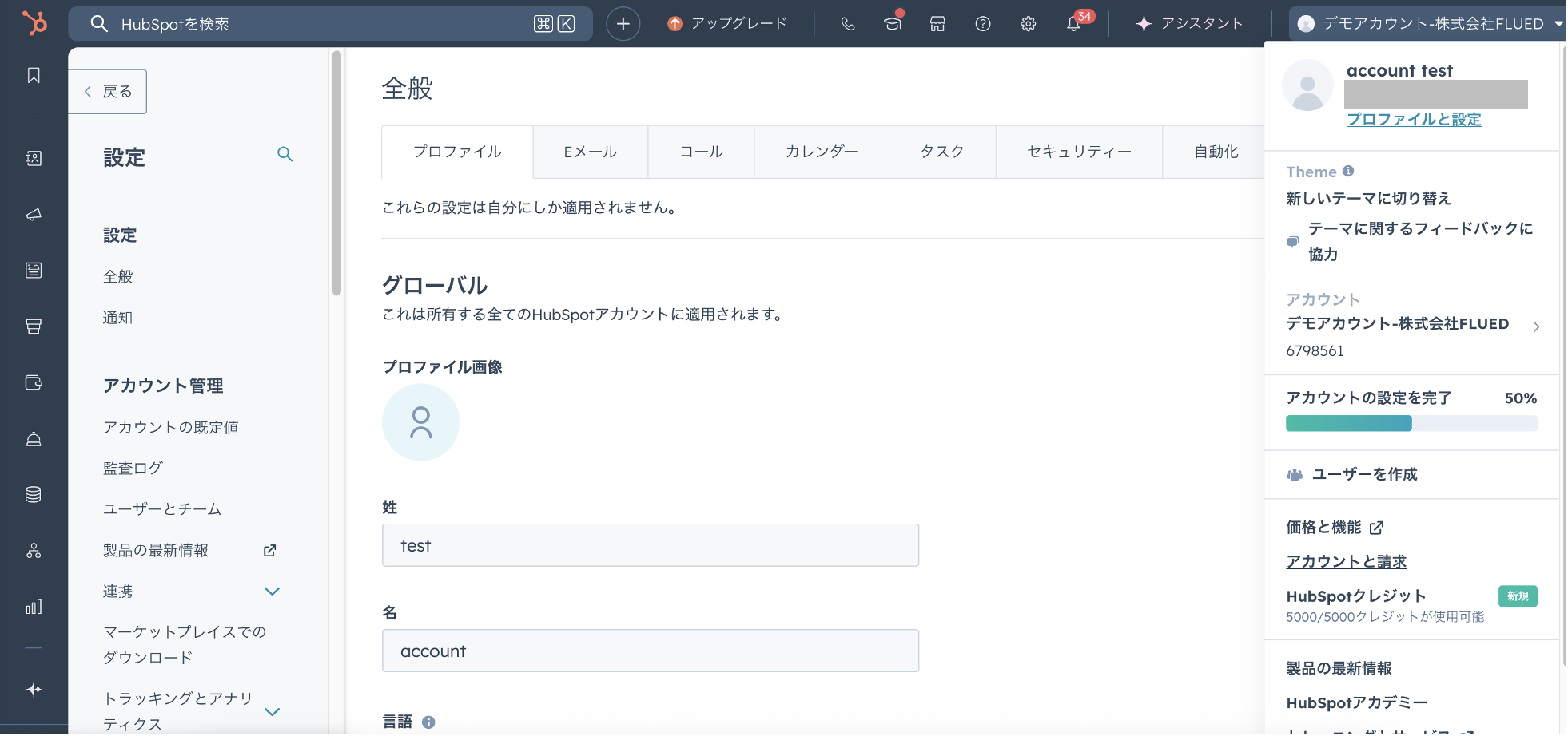 HubSpotクレジットの残量は、画面右上のアカウント名をクリックすると簡単に確認できます。