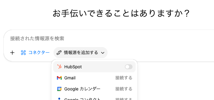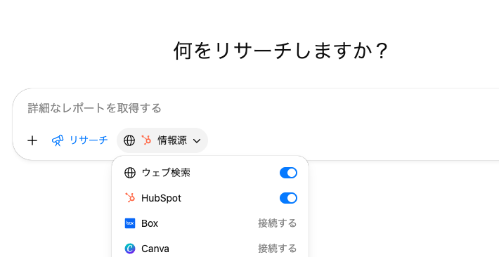 新しいチャットでDeep Researchを有効にし、データソースにHubSpotを指定すれば、利用可能です。