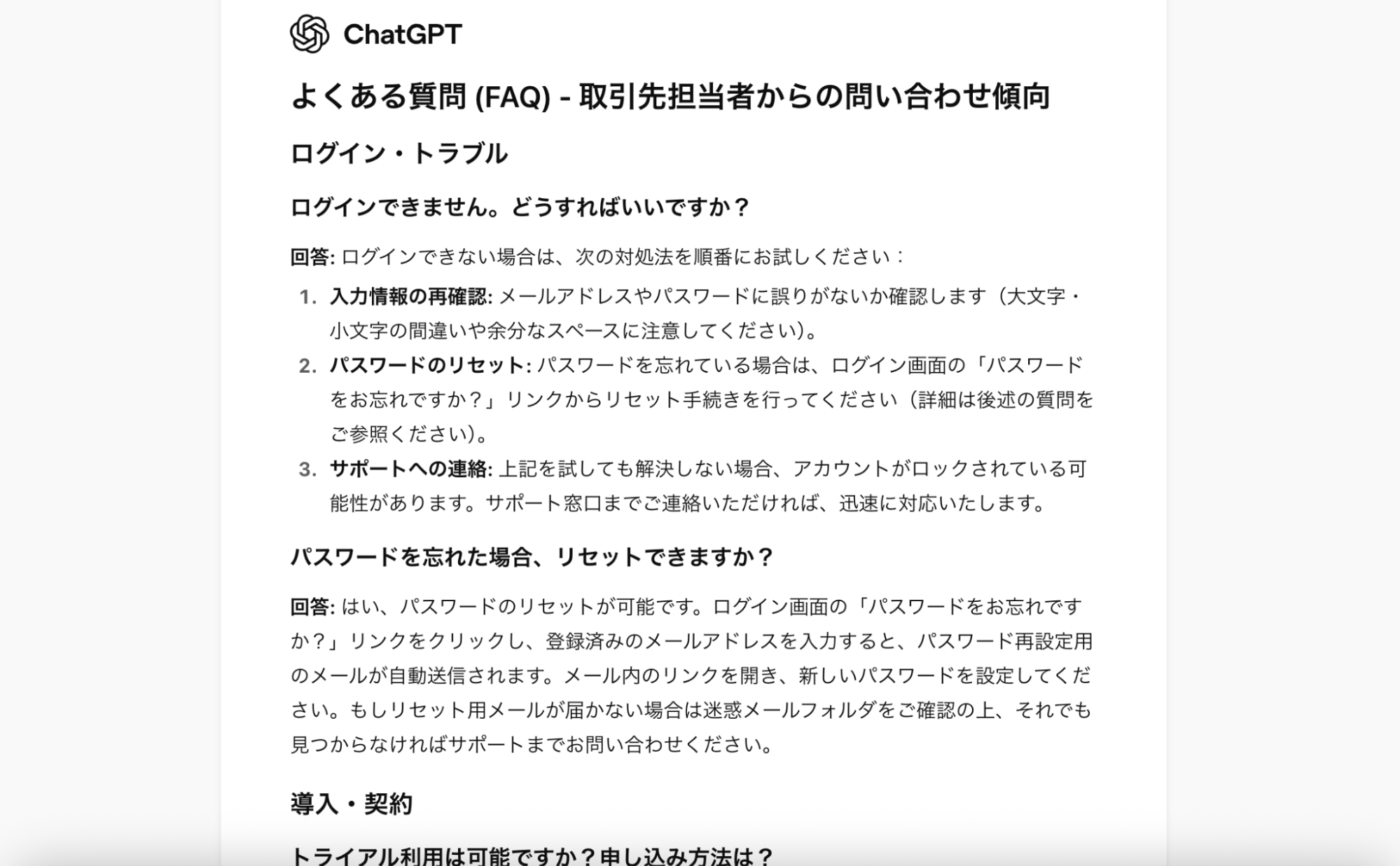 出力結果(要約) | 問い合わせログを分析し、ログイン・契約・操作・エラーなどFAQ候補を10項目抽出。各質問には回答のたたき台も含まれている |