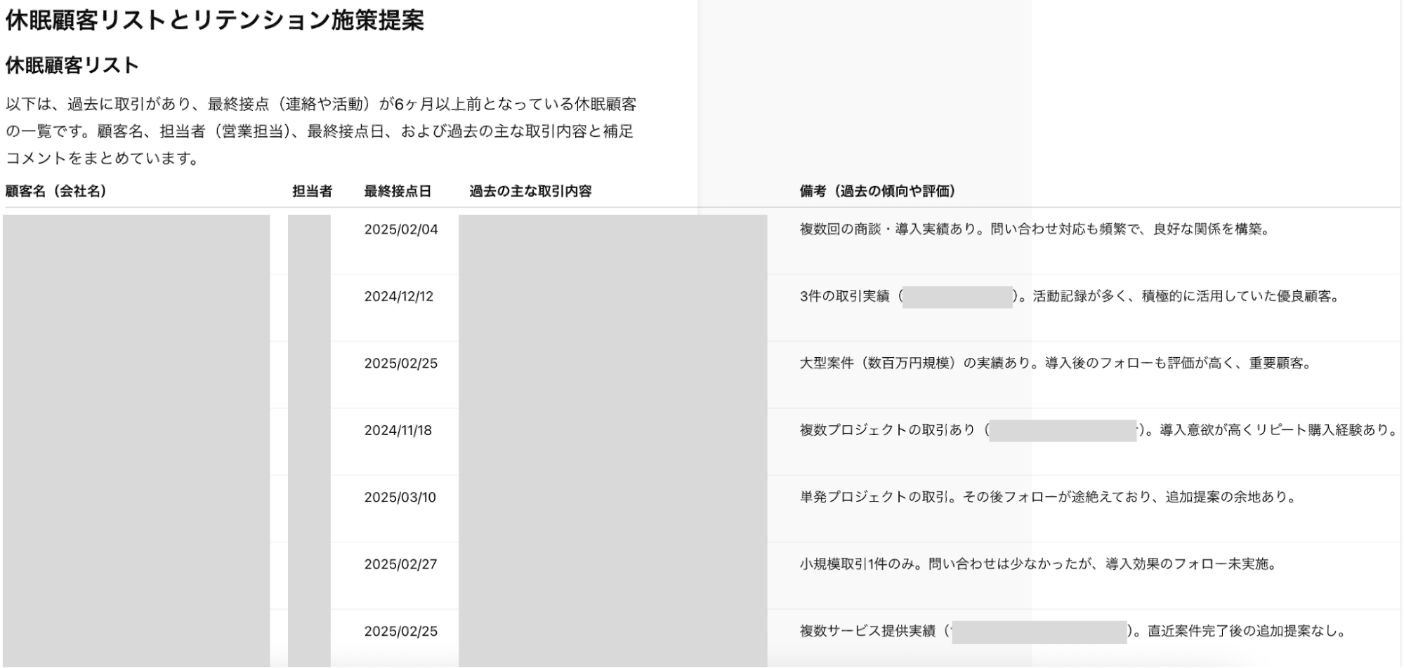 出力結果(要約) | コンタクトデータから最終接点が6か月以上前の休眠顧客を抽出。顧客名・担当者・過去取引内容とともに、メール施策やウェビナー招待といったリテンション案が提示された |