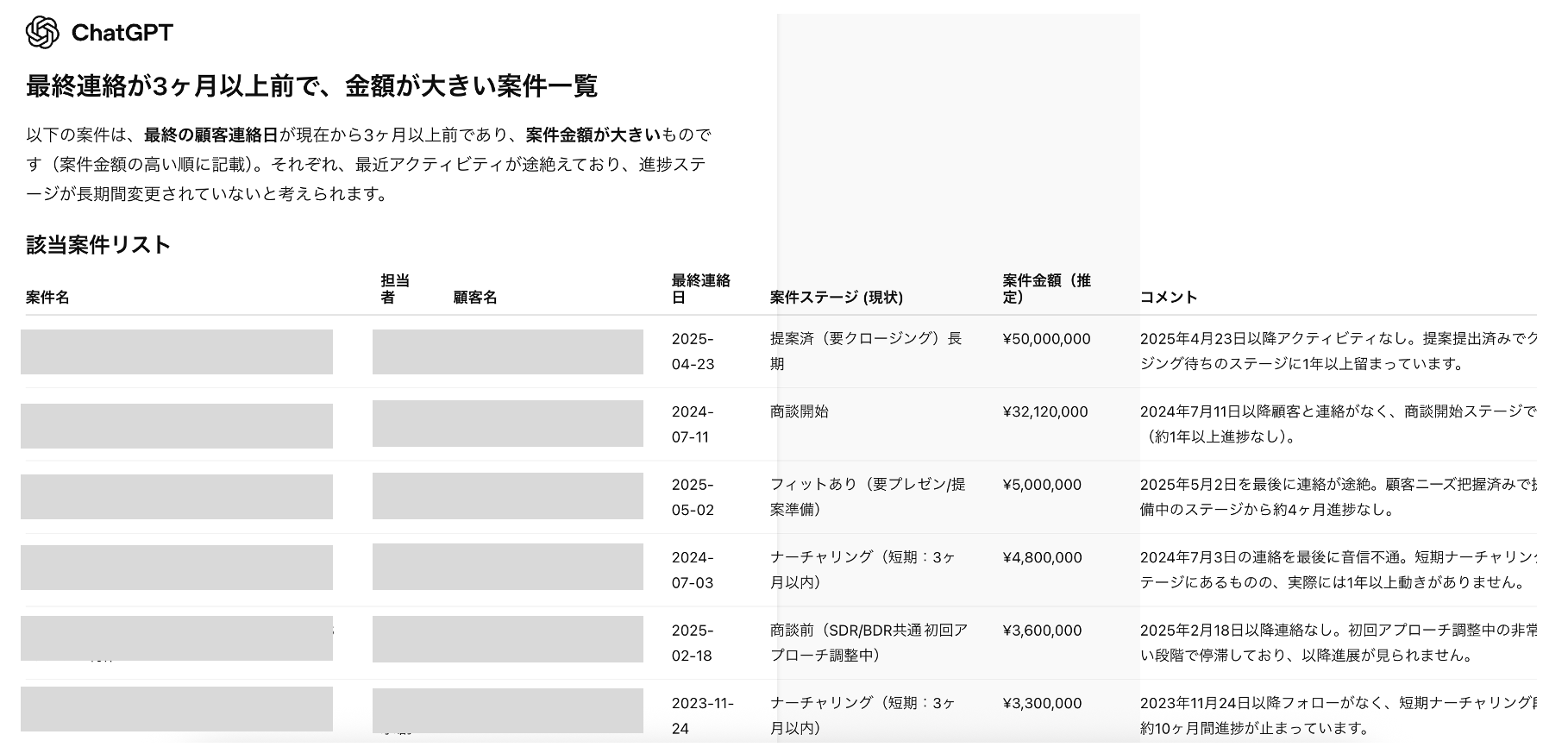 出力結果(要約) | 取引データから、最終連絡が3か月以上途絶えている大型案件を抽出。5,000万円規模の提案済み案件など、担当者・ステージ別にリスト化された |