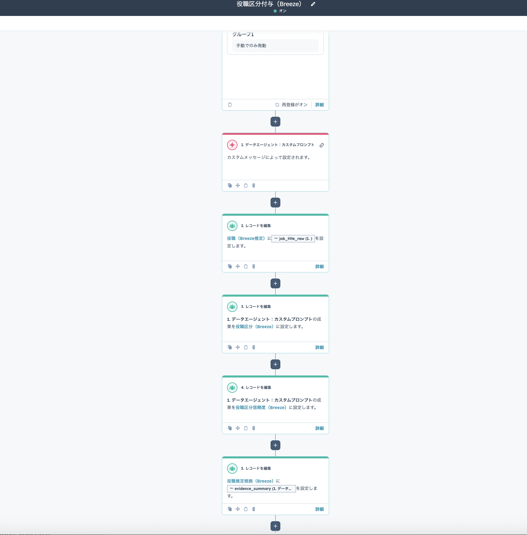 ワークフロー内にBreezeデータエージェントを実行すると、各コンタクトのWeb情報を元に役職区分を推定します。その結果を、プロパティへ自動反映する仕組みです。