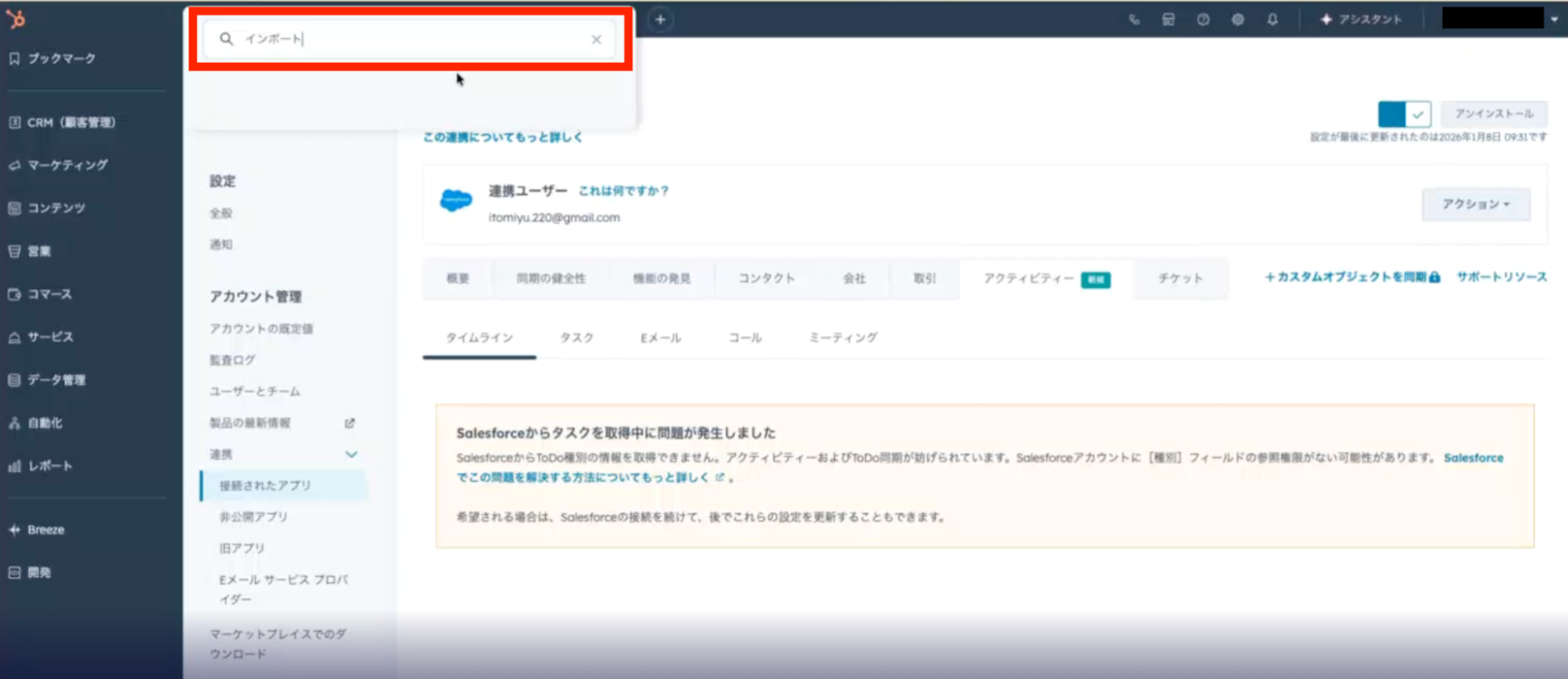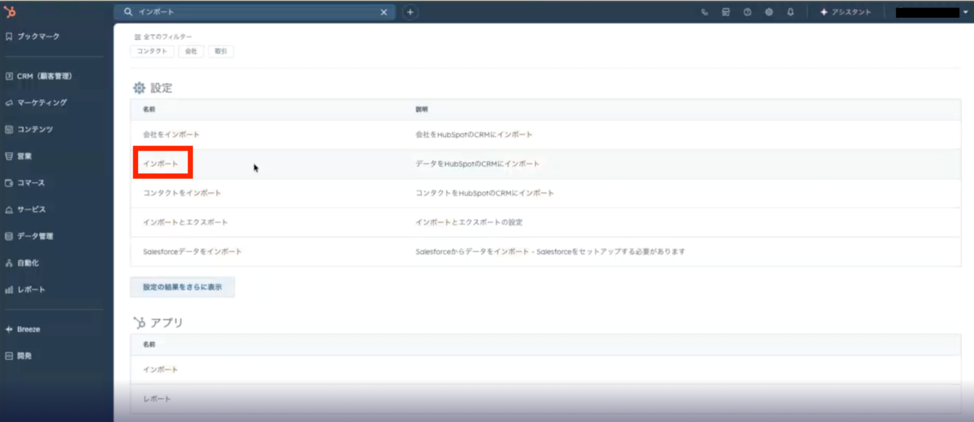 まずは、HubSpotのダッシュボードから「インポート」と検索しましょう。