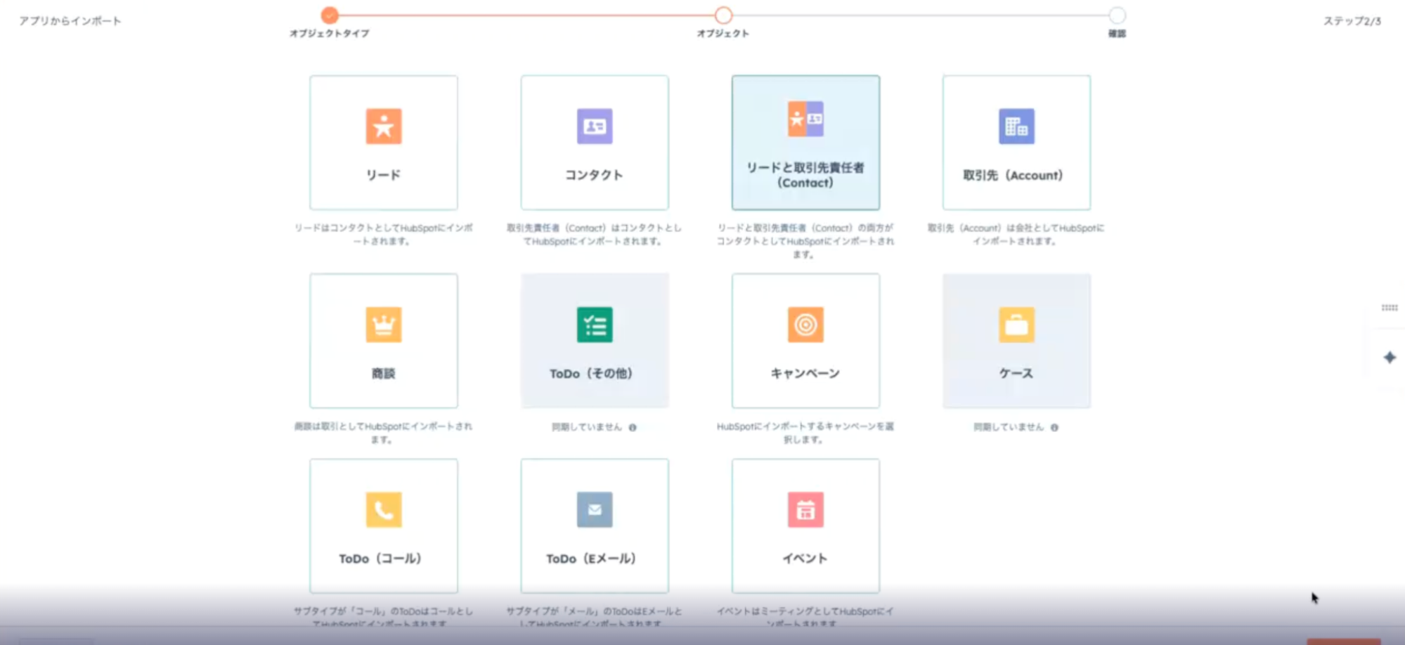 Salesforceでは「リード」または「取引先責任者」と呼び、HubSpotでは「コンタクト」と呼びます。HubSpot側で新規コンタクトレコードを作成した際には、どのオブジェクトとして同期するかの設定が可能です。