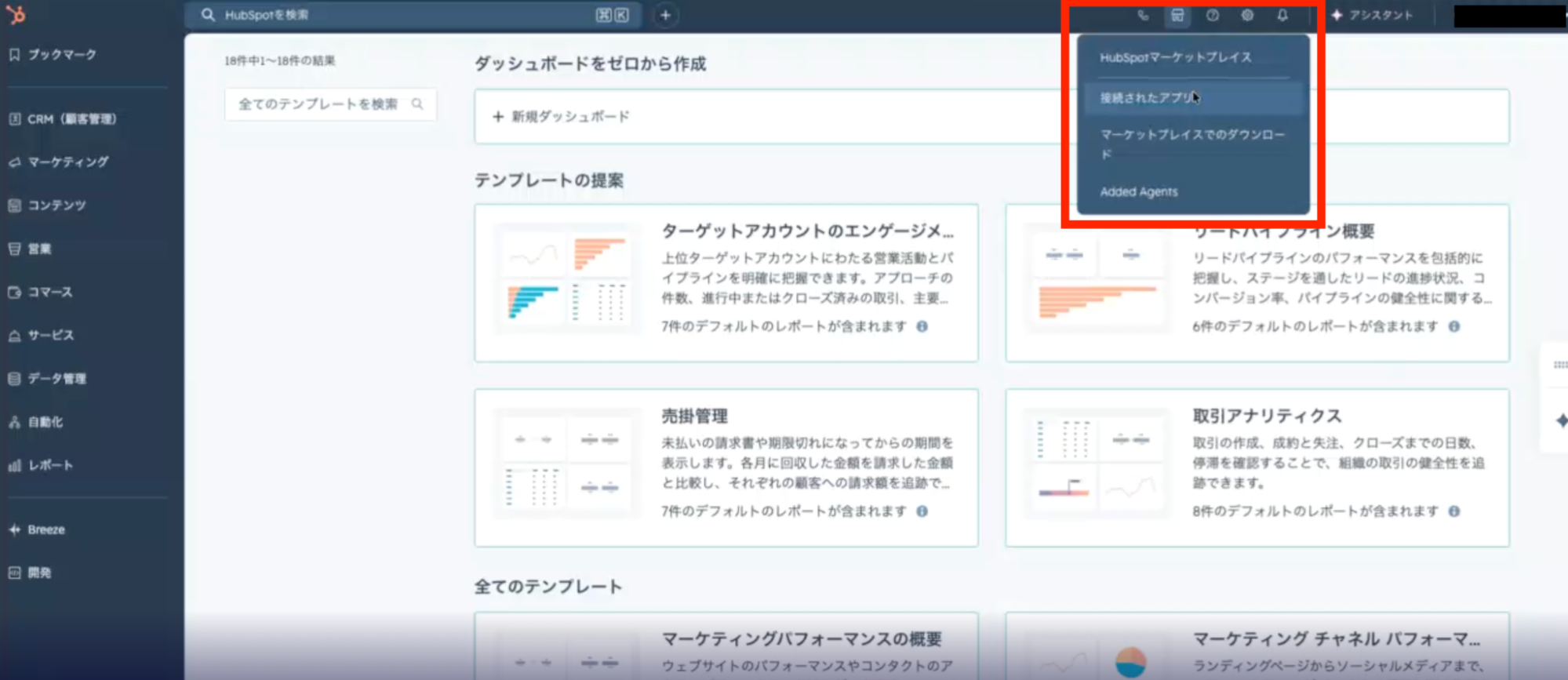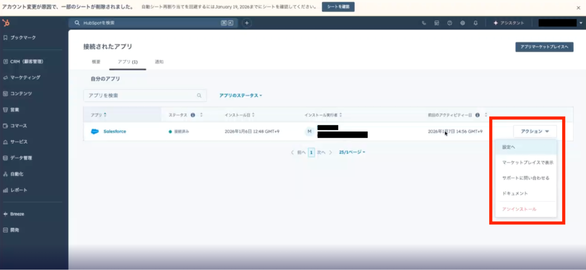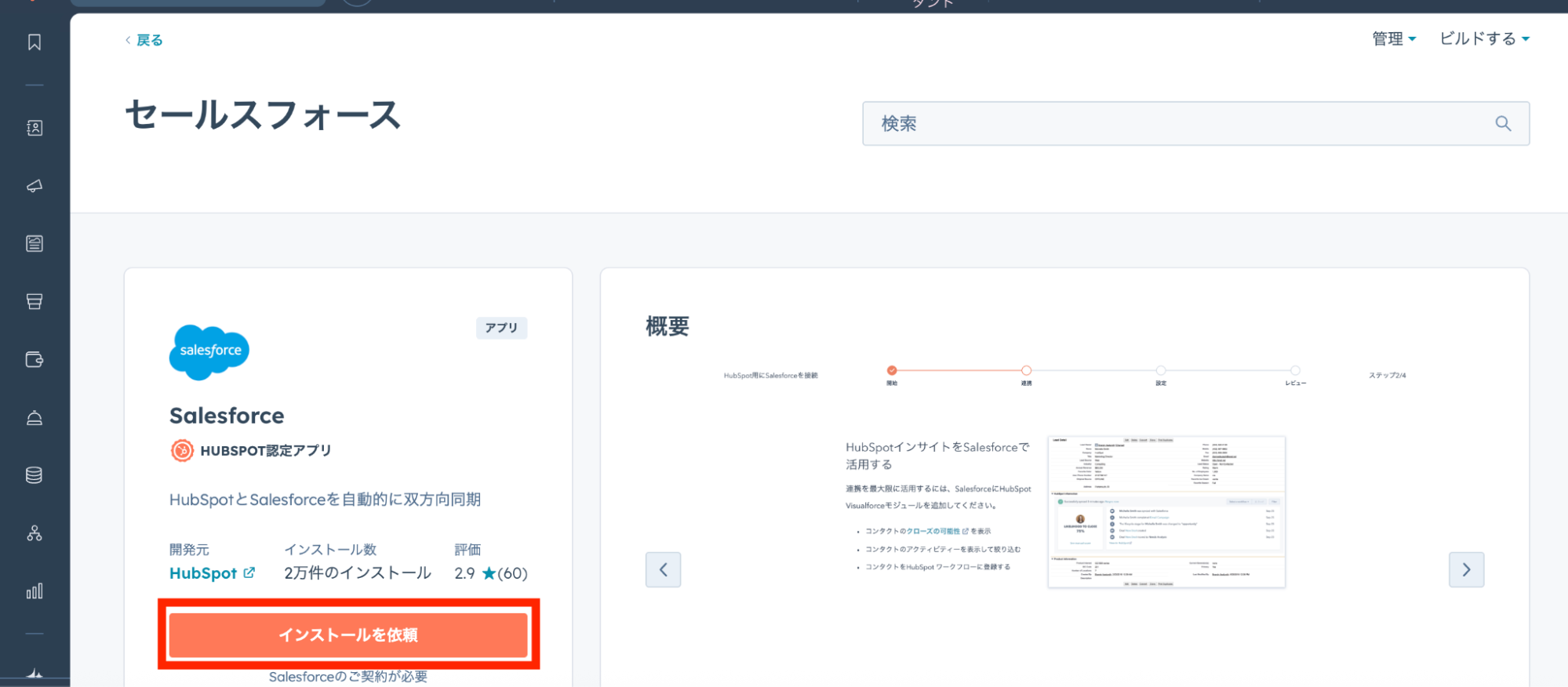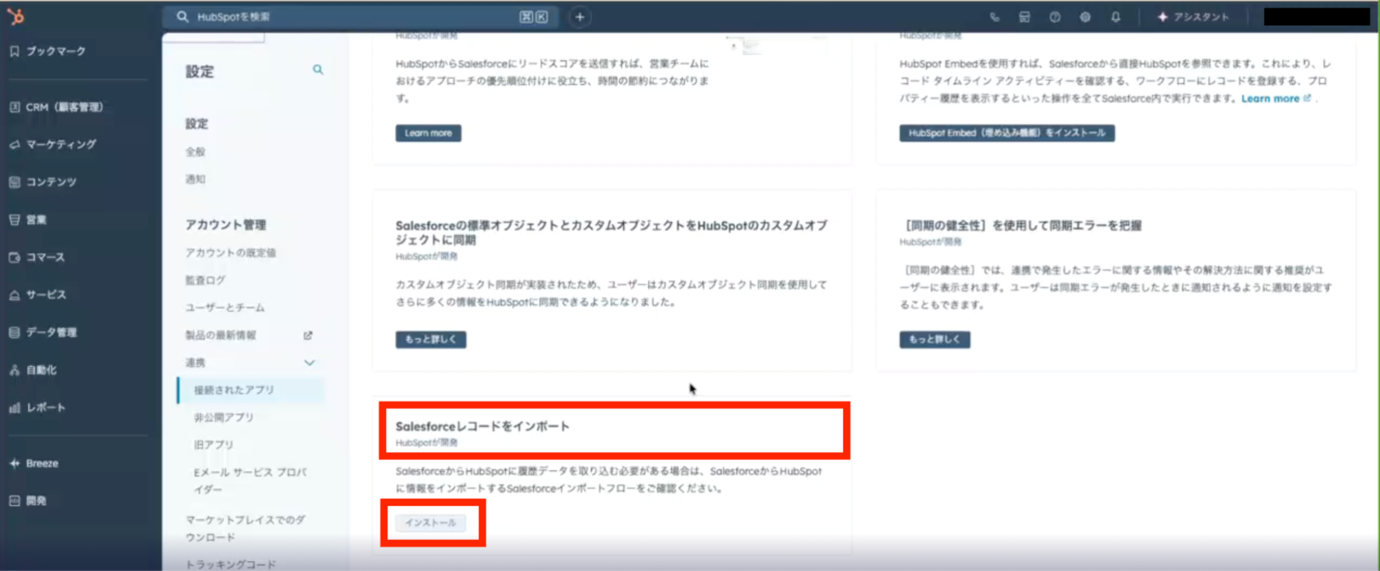 まずは、SalesforceのアプリをインストールしたうえでHubSpotのダッシュボードを開きます。