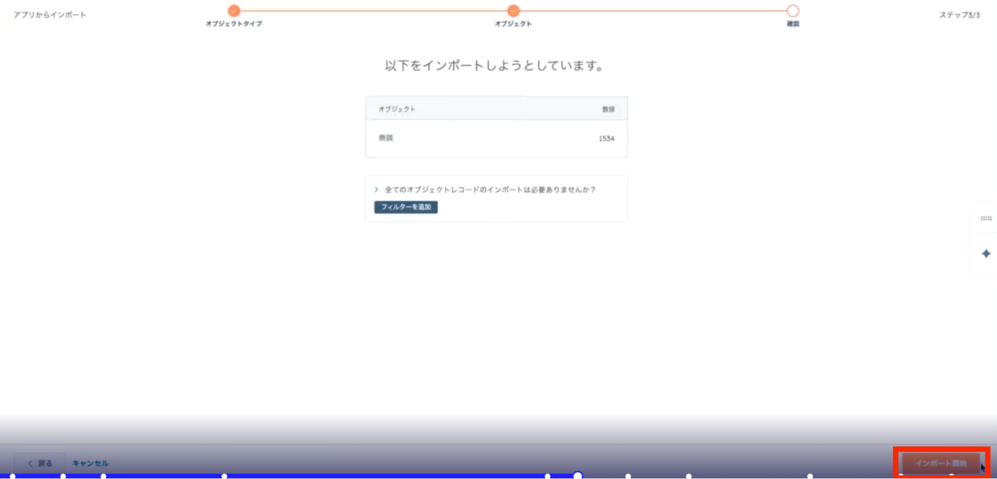 下記のようにインポート対象の件数が表示されるので、右下の「インポート開始」をクリックしてください。