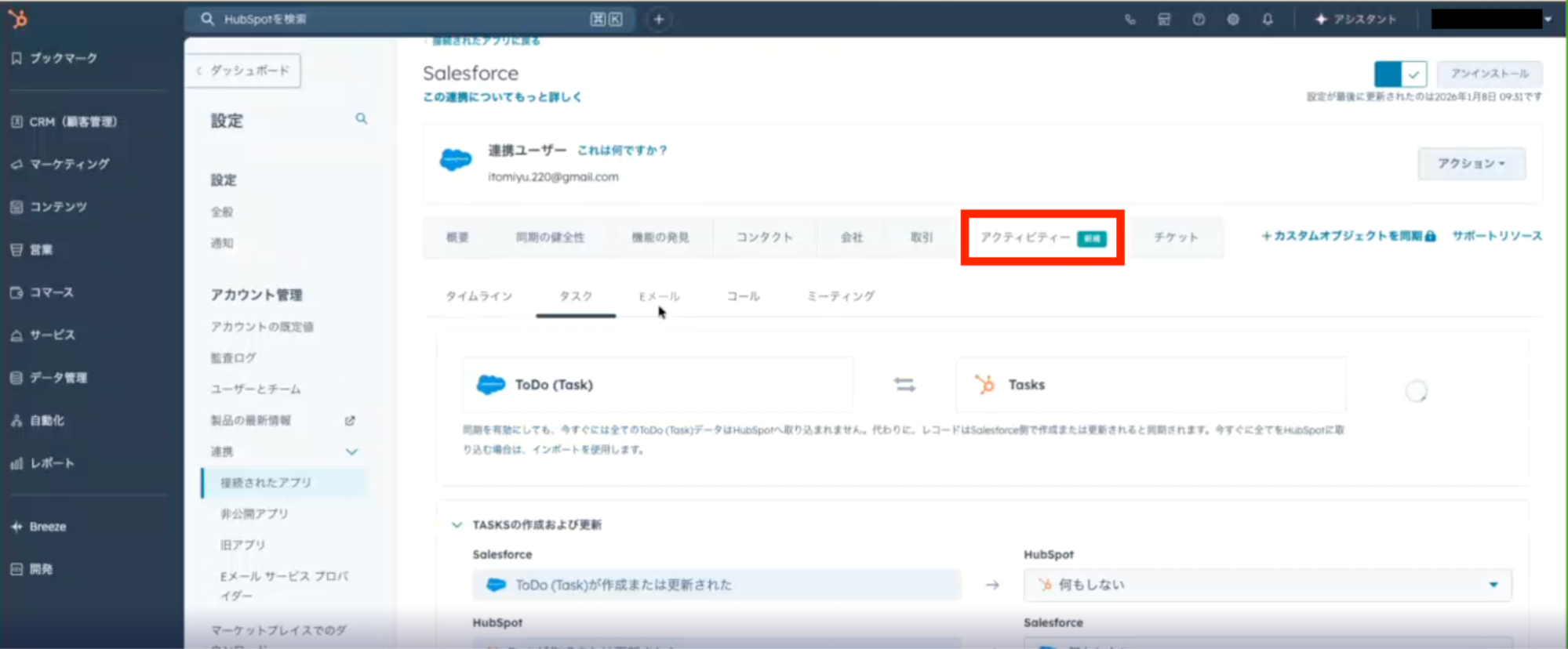 しかし、2024年末のアップデートにより、現在は通話・メール・ミーティング・タスクなどのアクティビティを双方向で同期できるようになっています。両ツール間で最新の顧客対応履歴を共有できるため、営業やマーケティング活動の情報分断を防ぐことが可能です。
