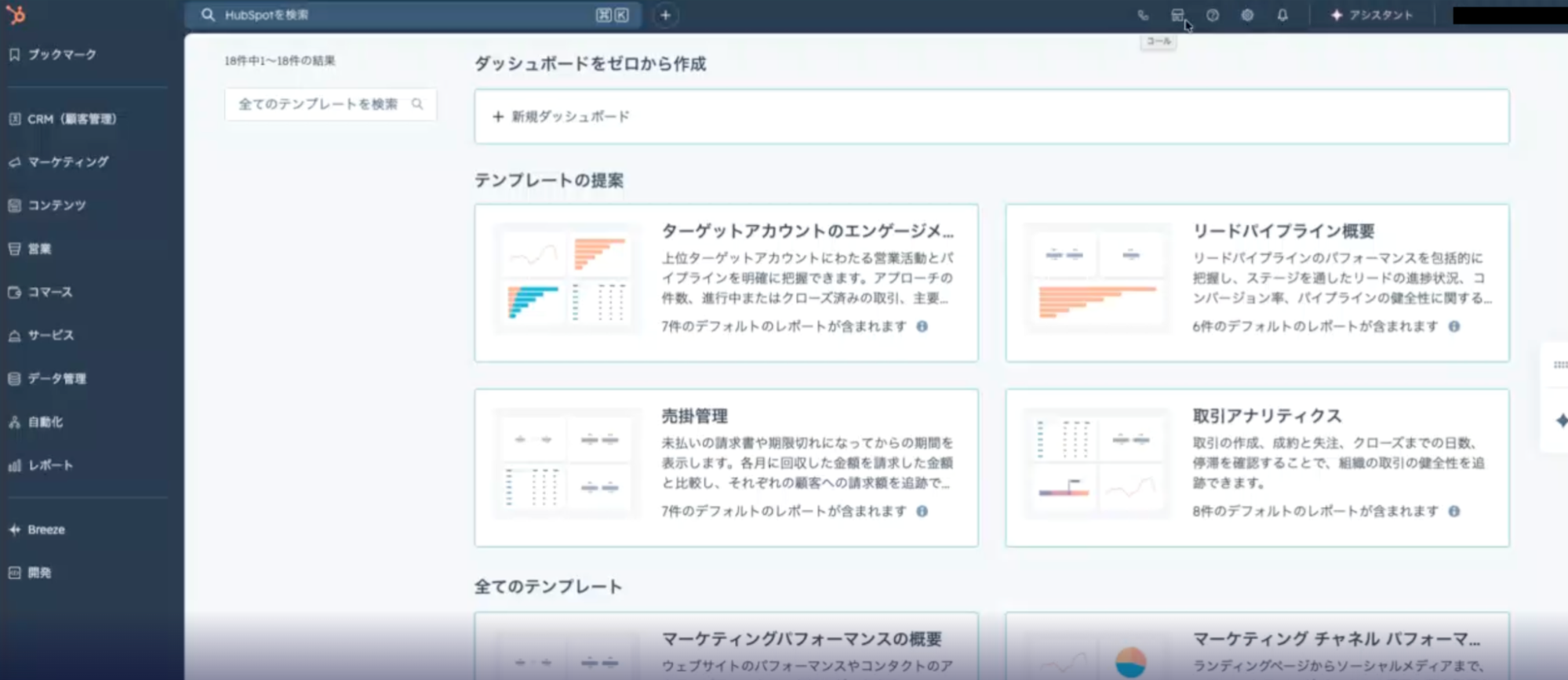 まずはHubSpotのダッシュボードで「機能の発見」タブをクリックします。