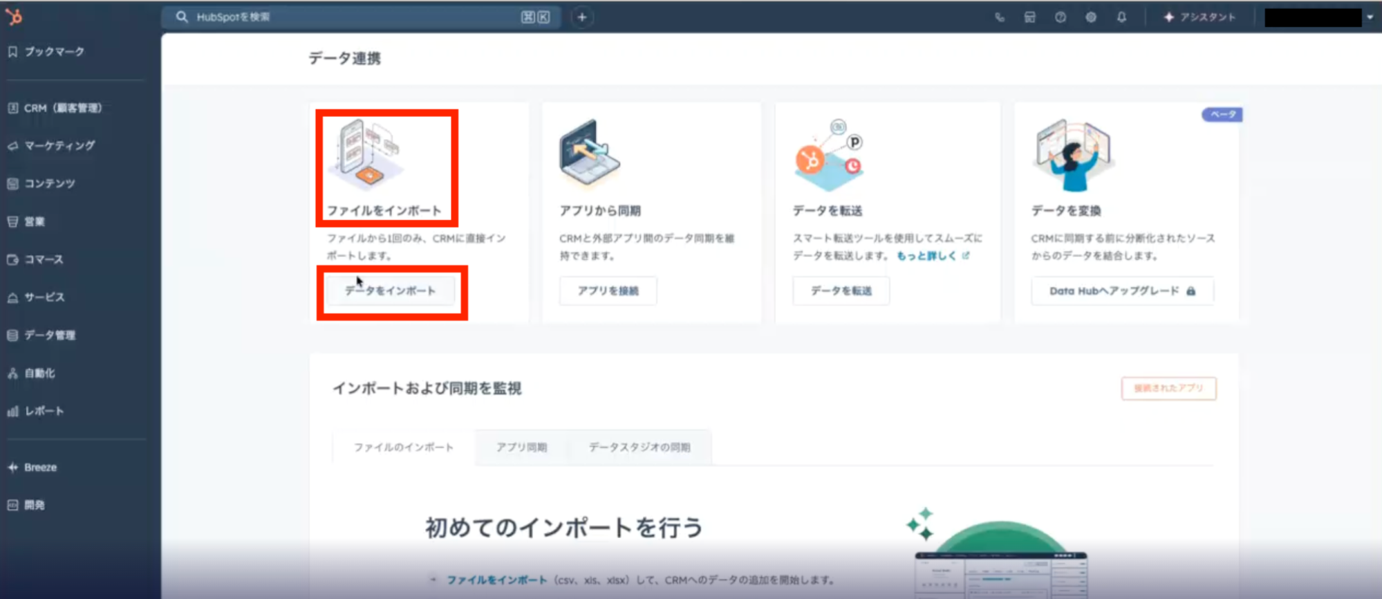次に、エクスポートしたCSVデータをHubSpotにインポートします。