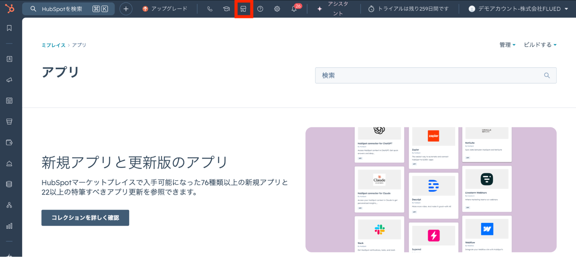 HubSpotにログイン後、ナビゲーションバーからHubSpotアプリ「マーケットプレイス」を選択してください。お店のマークを押下し、アプリマーケットプレイスの「アプリ」をクリックします。